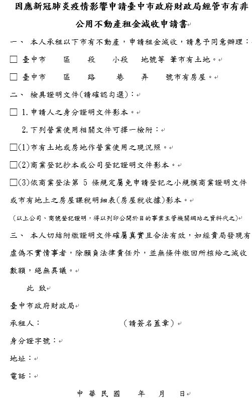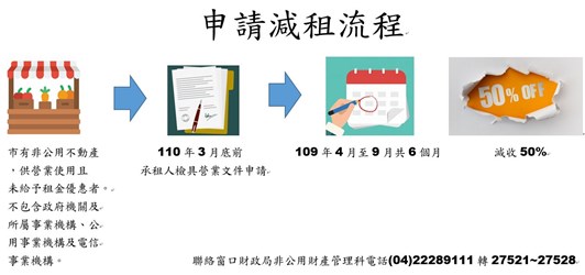 為降低新冠肺炎疫情對經濟的衝擊,台中市政府財政局即日起至9月30日止,針對承租市有非公用不動產且供營業使用者,減收租金50%,市府已發文通知承租戶,已享有租金優惠者除外,盼助業者紓困。