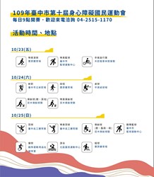 台中市政府運動局、台中市身心障礙體育總會共同主辦「109年第十屆台中市身心障礙國民運動會」,今(23)日至25日在台中市豐原體育場等場地舉行,共66個報名單位、293名教練職員、749名選手、359名裁判志工參與,今年因防疫考量取消開幕及頒獎儀式,市府運動局長李昱叡特別到豐原慈濟宮祈福,為選手加油打氣。