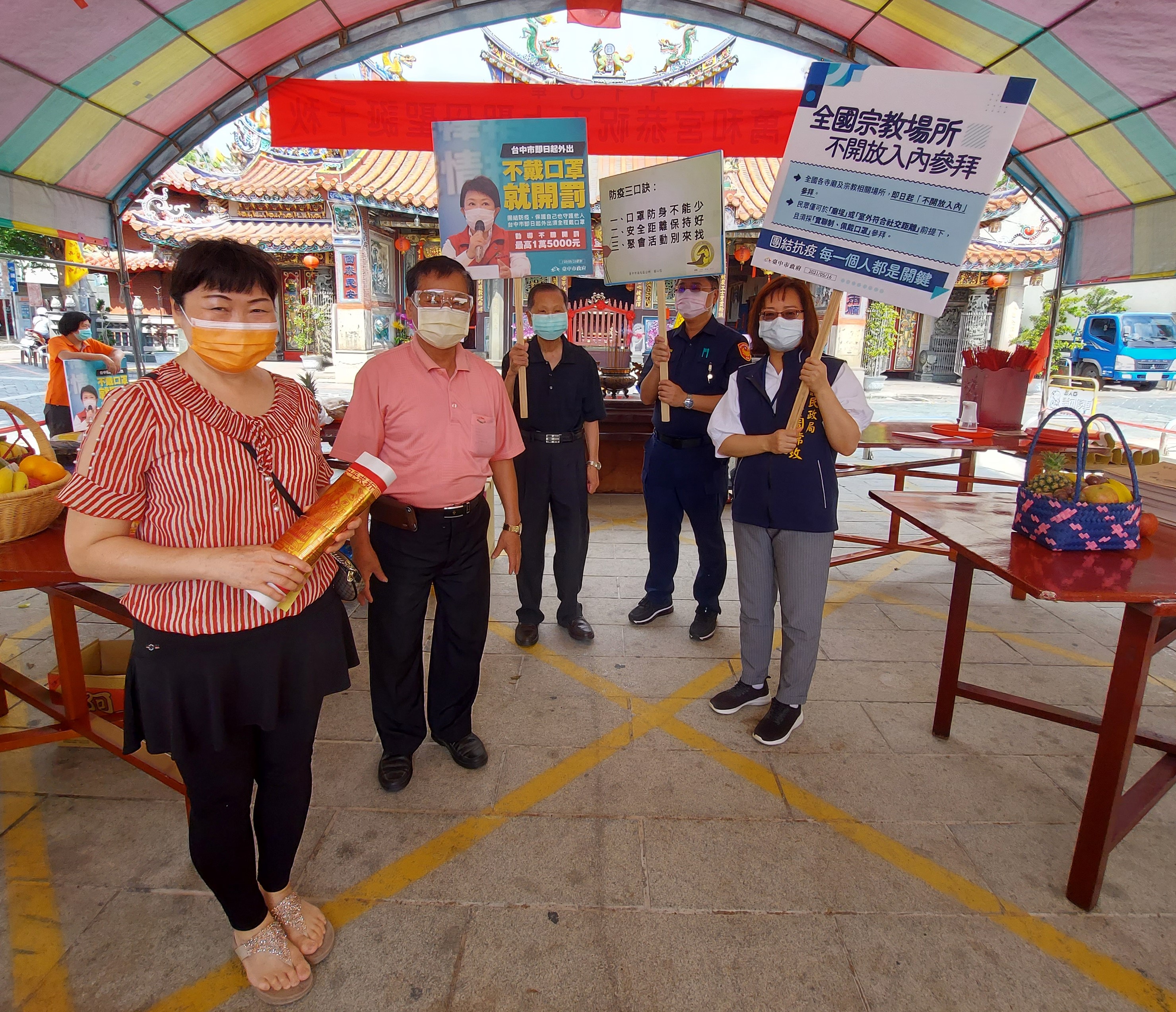 國內疫情嚴峻,中央疫情指揮中心宣布全國升至第三級警戒,民眾外出須全程佩戴口罩,經勸導不聽最重可罰1萬5,000元。台中市政府民政局副局長周瑺玫今(21)日前往南屯區萬和宮和文昌公廟視察宗教場所防疫情形,同時加強防疫宣導,並呼籲民眾疫情期間避免參加聚會活動或前往人潮聚集、密閉空間的公共場所,若有特殊情況須外出時,也請全程佩戴口罩,落實防疫措施。