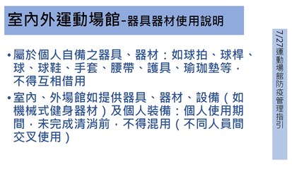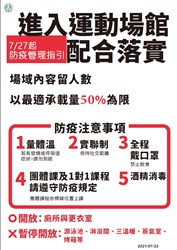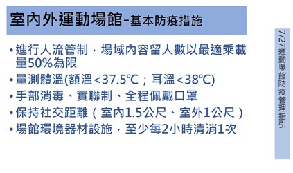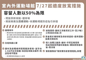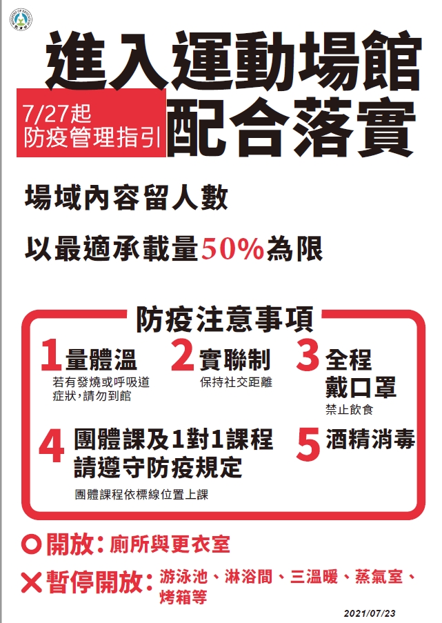 另外,國民運動中心、港區運動公園(不包括所轄游泳池及跳水池)配合防疫規定及防疫管理指引得開放使用;公立戶外運動場域方面,若現場有專人管理,可落實並管控實聯(名)制者,得開放使用;步道、操場或田徑場等屬走動式不接觸設施亦開放使用,但附設兒童遊具或體健設施等因難以保持社交安全距離、即時消毒及落實實聯(名)制,仍暫停開放。