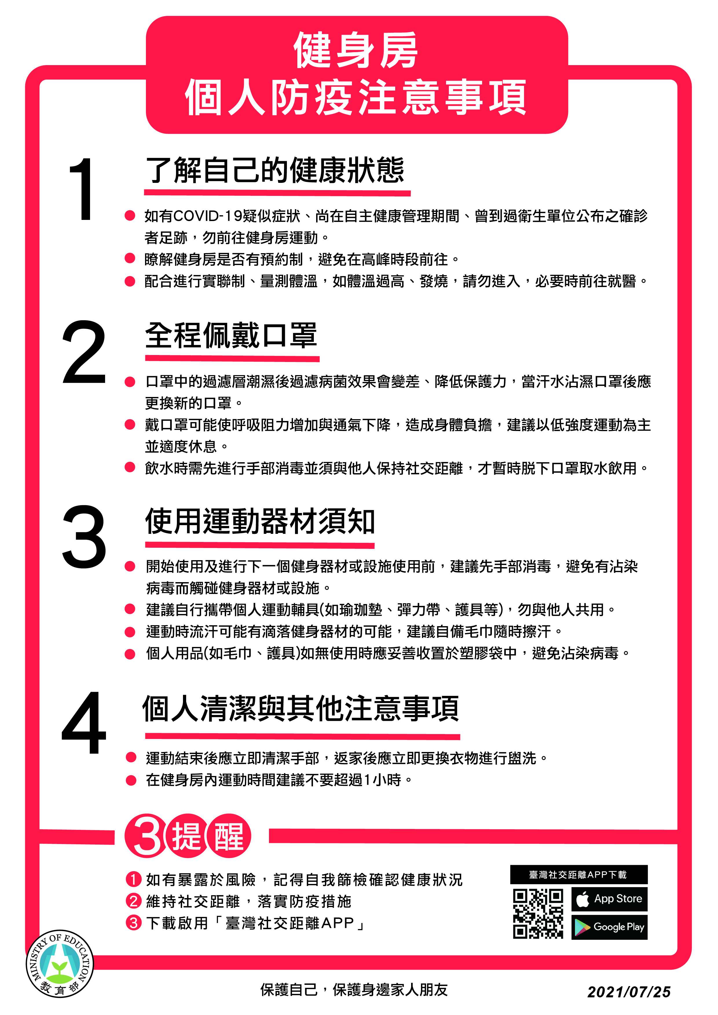 運動局提醒,業者應依體育署「競技及休閒運動場館業因應COVID-19防疫管理指引自我查檢表」自行檢核及填寫,若查獲違反指引,將依傳染病防治法及停止營業相關規定進行裁罰。相關疑問可撥打教育部體育署諮詢專線洽詢:(02)87711515、(02)87711843、(02)87711847、(02)87711881。(7/26*10 )* 運動局