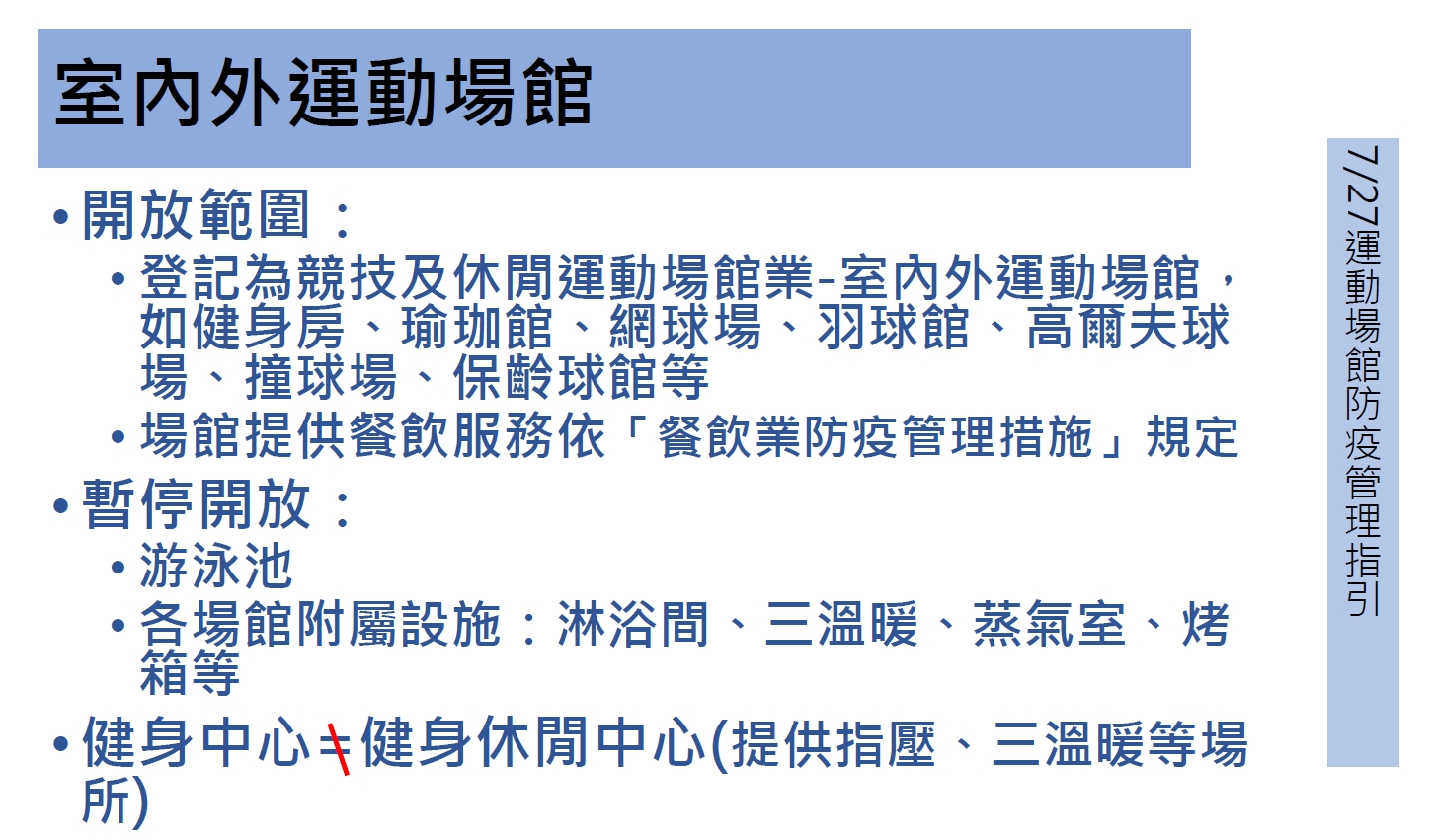 運動局說明,依據教育部體育署公告,適度開放對象為商業登記屬「競技及休閒運動場館業」的私人室內、外運動場館(游泳池除外),但各場館附屬設施,如淋浴間、三溫暖、蒸氣室、烤箱等仍不得開放。