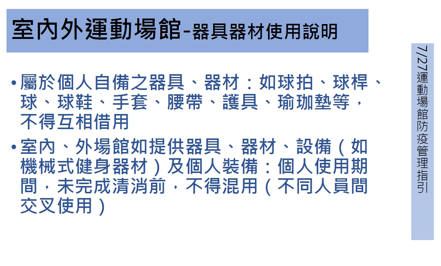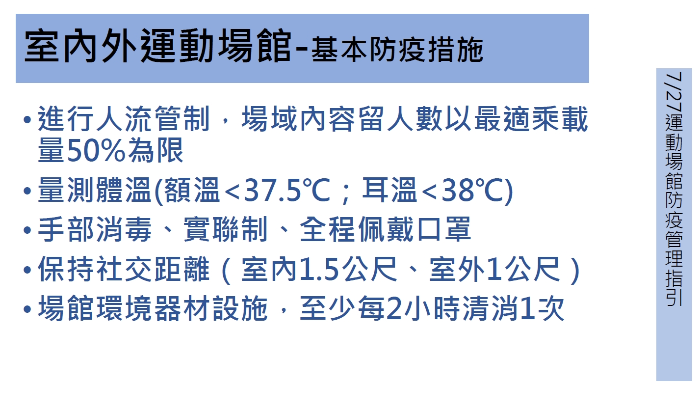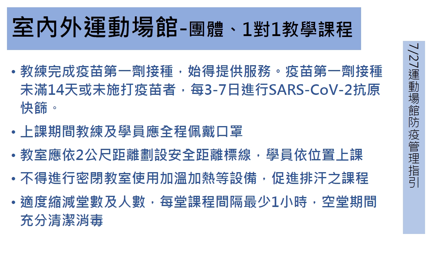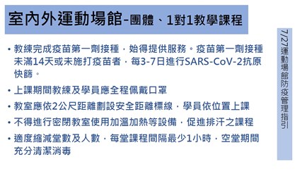 場館業者應遵循防疫管理指引,場域內容留人數以最適承載量50%為限、實聯制、全程佩戴口罩、保持社交距離、個人自備器具或器材不得互相借用,如由場館提供器材或器具,轉換使用者前後應消毒、器材及設備應維持間隔開放使用,並符合1.5公尺社交距離,如無法維持則該區域不開放、加強環境、器材消毒清潔工作,至少每2小時清潔消毒1次、業者應於撞球檯及保齡球道前,提供酒精、拋棄式擦拭布,每球檯及每球道以2人為限、教練未施打疫苗或接種未滿14天者,於第1次授課前,應提供3日內快篩或PCR檢驗陰性證明,且每3至7天需再定期快篩,業者應造冊紀錄。