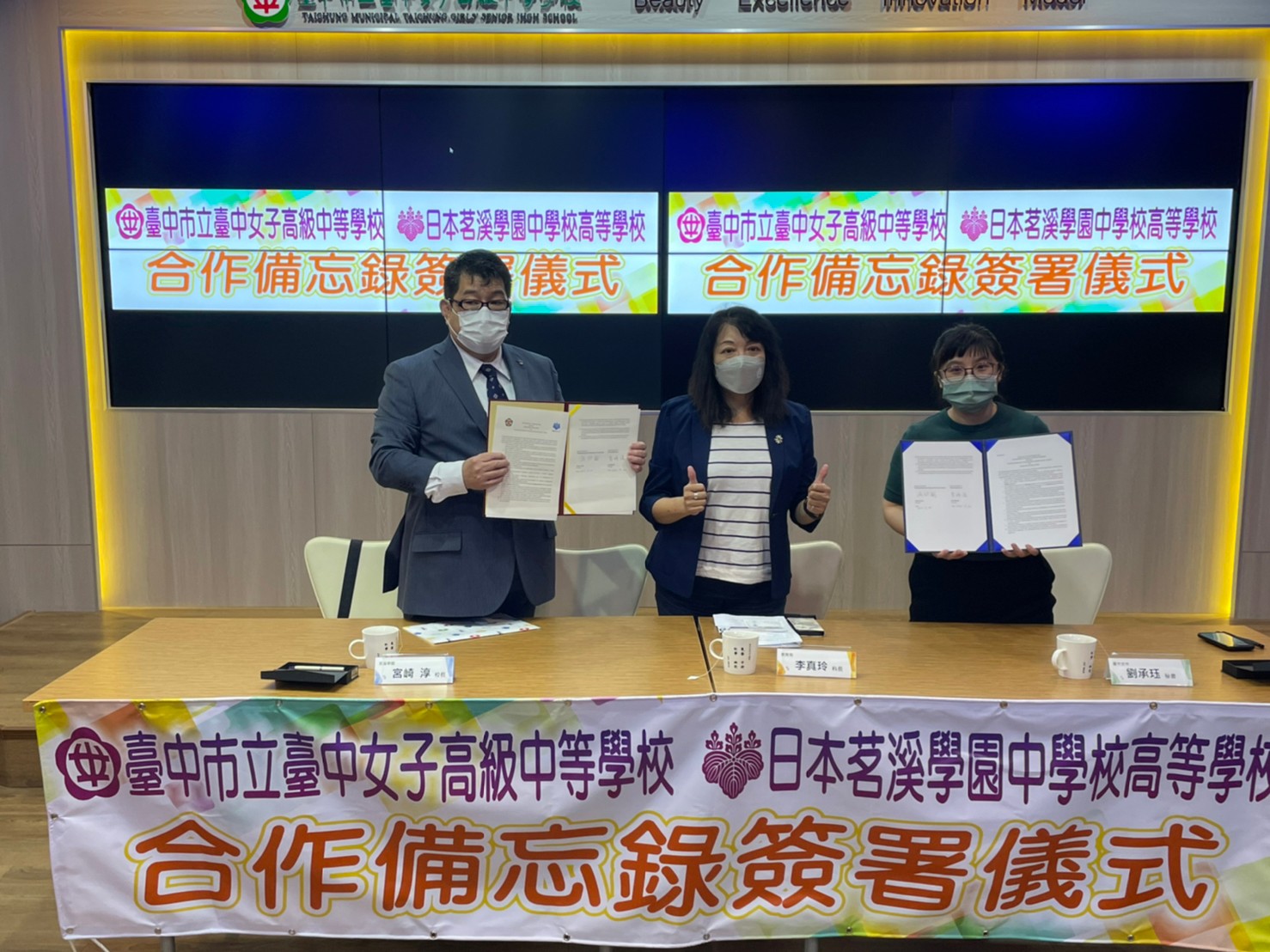 台中女中今(20)日舉辦與日本茗溪高校合作備忘錄簽署儀式,台中市政府教育局科長李真玲出席見證。台中女中表示,兩校互動已逾4年,即使疫情期間仍透過視訊交流,互動更為熱絡;疫情後決定提升合作內容,包括兩校學生可交換就讀1年,相互提供免費食宿及學雜費減免。