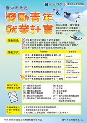 鼓勵待業青年積極尋職、穩定就業。台中市政府勞工局持續推動「獎勵青年就業計畫」,今年全國首創新增「弱勢青年就業獎勵金」,針對設籍台中市29歲以下低收、中低收入戶或背負學貸壓力的弱勢青年,經推介就業滿3、6個月,各加碼發給5,000元獎勵金,就業滿6個月最高可領3萬5,000元獎勵金,截至今年9月15日共協助超過50名弱勢青年就業成功,減輕就業初期經濟負擔。