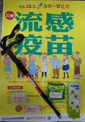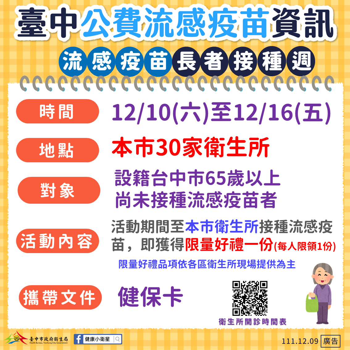 台中市政府應流感高峰季節,1210日至16日推出「長者流感疫苗接種週」,提升長者保護力。衛生局表示,凡設籍台中市65歲以上長者,接種週期間至全市各區衛生所接種公費流感疫苗,即可獲得接種好禮,包含登山杖、水晶肥皂、隨身水瓶和牙線棒等,隨機發送,每人限領一份,送完為止。