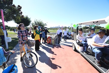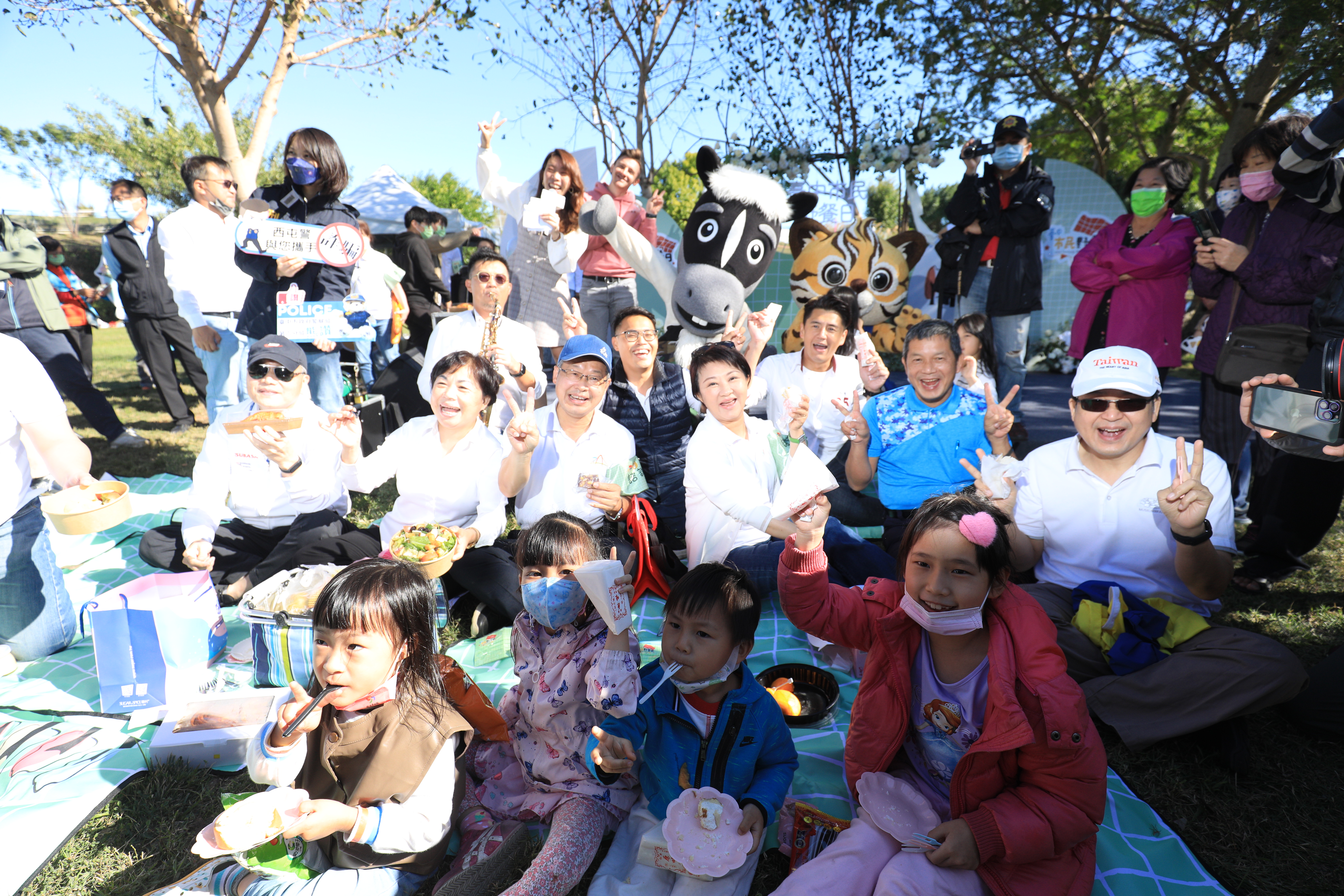 盧市長隨後也搭上高爾夫球車沿路和野餐民眾打招呼,跟民眾、毛小孩自拍,並發放聖誕節糖果餅乾禮盒給小小朋友。許多家庭準備野餐籃、鋪著限量紀念野餐墊拍照,並帶著小朋友聽故事媽媽劇場,台中市的城市吉祥物石虎也現身跟大小朋友合影,現場氣氛極為chill!