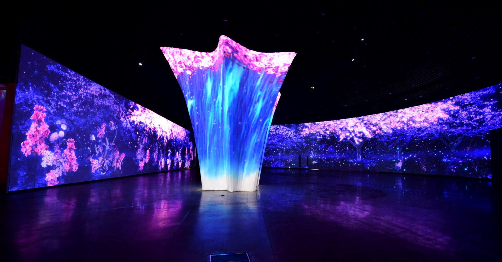 另外,花舞館出入口也利用雷射營造奇幻感,入口處設置「極光秘境」,撒上點點星光;出口前的「幽靜空間」,讓人彷彿被光的窗簾圍繞,還有有趣的「互動空間」,即時捕捉觀眾動態,在牆面呈現剪影與光點。