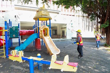 「滴水不漏、不可鬆懈!」環保局針對校園內戶外開放及休憩空間消毒,重點範圍包括遊樂設施、球場設施、1樓洗手台、1樓廁所;教育局也將督導學校,加強學生經常接觸的門把、桌面、電燈開關或其他公共區域消毒。