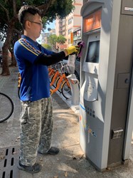 因應新冠肺炎疫情,台中市政府交通局落實各項大眾運具防疫工作,除針對計程車、公車進行消毒,也全面加強公共自行車(iBike)消毒作業,交通局長葉昭甫表示,已要求微笑單車公司每日以稀釋漂白水全面消毒自行車及相關設備,尤其民眾較常接觸的地方,包含租賃站Kiosk主機、自行車把手及座墊等,讓市民安心騎乘。