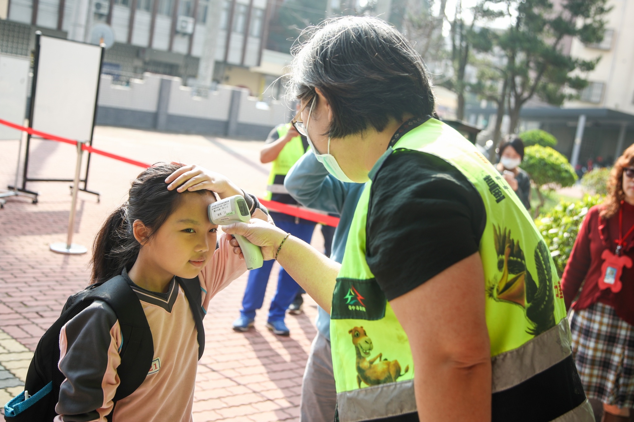 校園量測額溫 因應全球新冠肺炎疫情急速升溫,台中市政府教育局表示,國內近期新增確診案例許多為境外移入感染,為強化校園防疫,本學期結束前,禁止公私立高中職以下師生出國,若有特殊原因者,則須將出國計畫送交教育局審核,另外學期中將再視疫情發展,評估此禁令是否延長。(3/16*23)*教育局 聯絡人:台中市政府教育局 聯絡電話:04-22289111