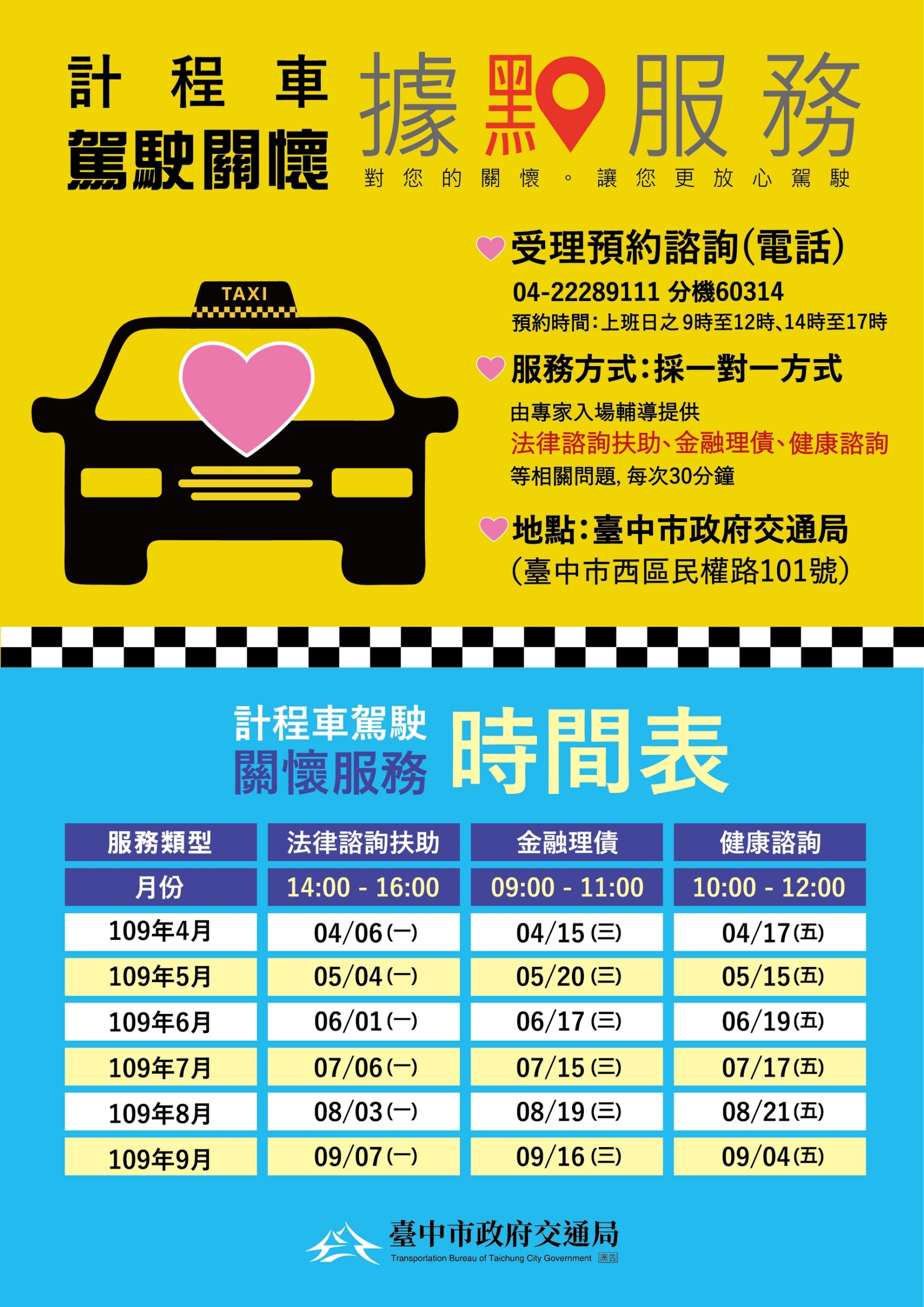 台中市政府交通局去年10月起在交通局辦公廳舍成立計程車駕駛關懷服務據點,透過專家一對一輔導,協助計程車駕駛排解疑難雜症,獲司機好評。因應疫情發展,關懷據點即日起將於每月第1個星期一、每月第3個星期三、每月第3個星期五,分別提供法律、金融理債及健康免費諮詢,同時宣導計程車防疫秘訣,讓民眾安心搭乘。