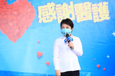 今天盧市長特別戴上寫有「我挺臺中」的口罩套參加活動,她說,口罩套是志工們集結愛心共同製作,表達對自己城市的認同與愛,也表達了對醫護的滿滿感謝。