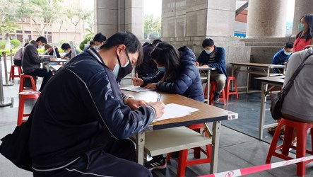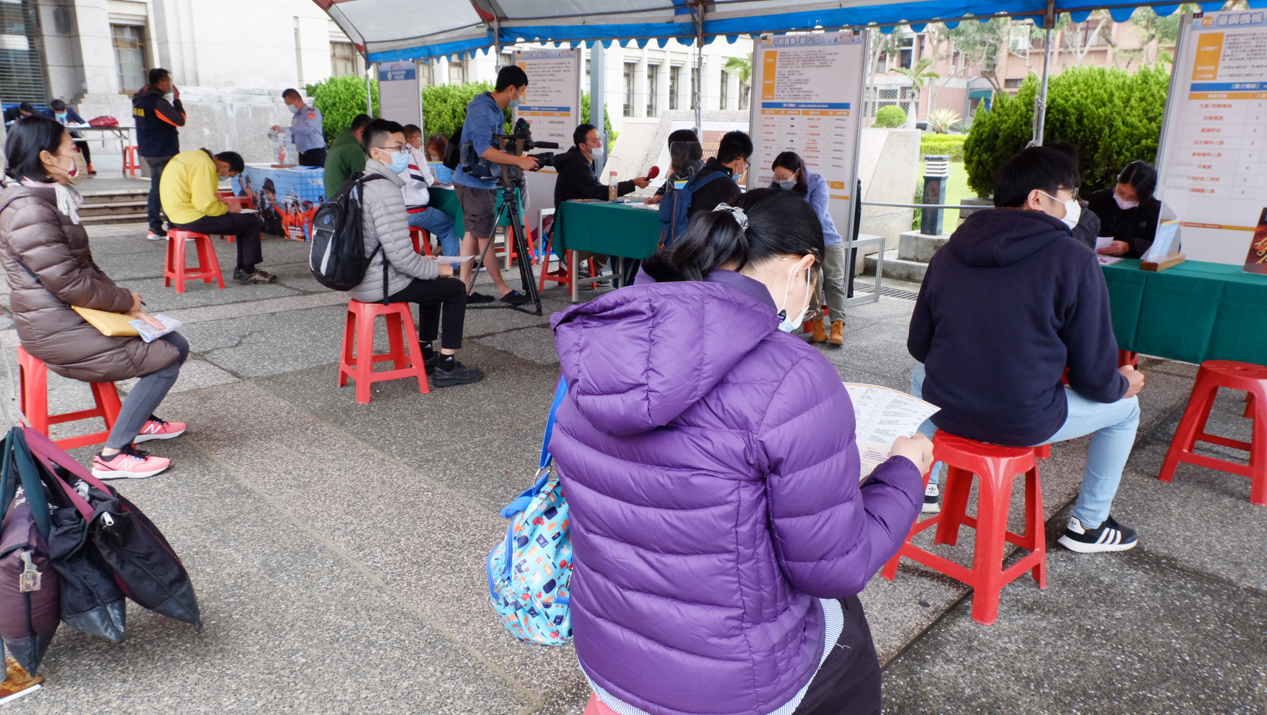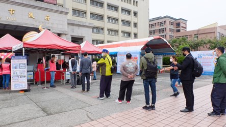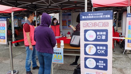 另外為因應疫情,本次徵才活動採「戶外」及小型規模辦理,現場除加強人潮分流管制外,也設置防疫檢測站,嚴格進行體溫測量控管及酒精消毒措施,並採實名登記,請參加者填寫健康關懷問卷等,活動中求職者、廠商及工作人員也全程戴口罩,打造「金安心」的求職環境。