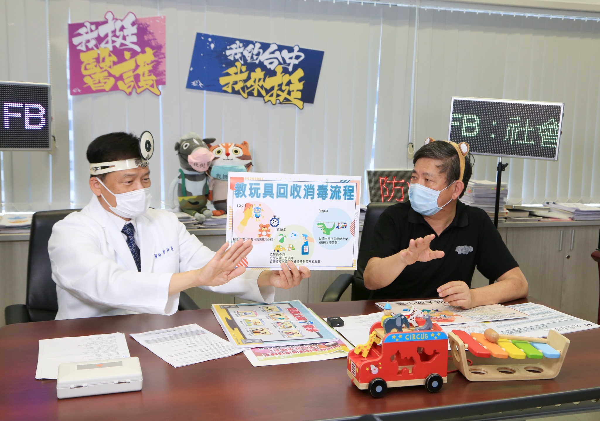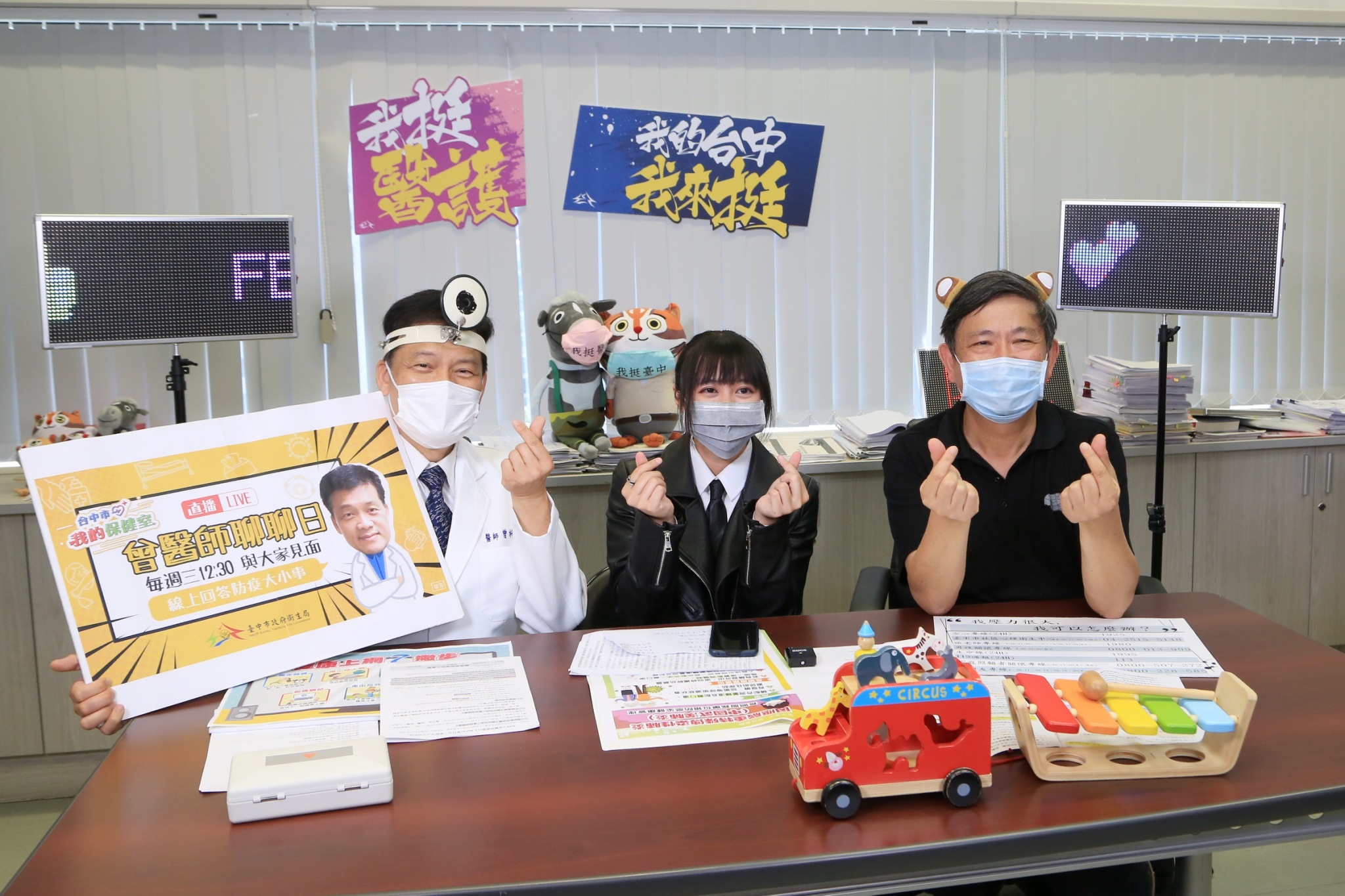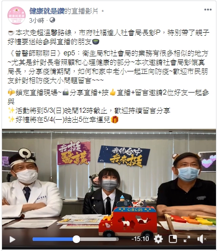 因應新冠肺炎疫情,台中市政府衛生局全國首創於官方臉書《健康就是讚》推出《我的保健室:曾醫師聊聊日》直播活動。今(29)日「曾醫師」衛生局長曾梓展邀請到社福達人社會局長彭懷真分享親子館、社區關懷據點防疫作為,並與明台高中網紅「小酸」合唱《明天會更好》,期盼疫情能儘速消弭,讓生活更美好。