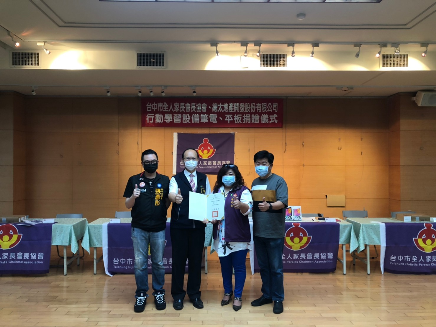 因應新冠肺炎疫情,為協助停課學生線上學習,台中市政府教育局全面調查各級學校平板數量,若有不足即購買補齊,台中市全人家長會長協會理事長陳昭舒也共同響應,邀請多家在地企業捐贈偏鄉學校43台平板電腦及117台筆電,總太地產開發公司也捐贈100台平板電腦,教育局長楊振昇感謝企業善盡社會責任,讓學子停課不停學。