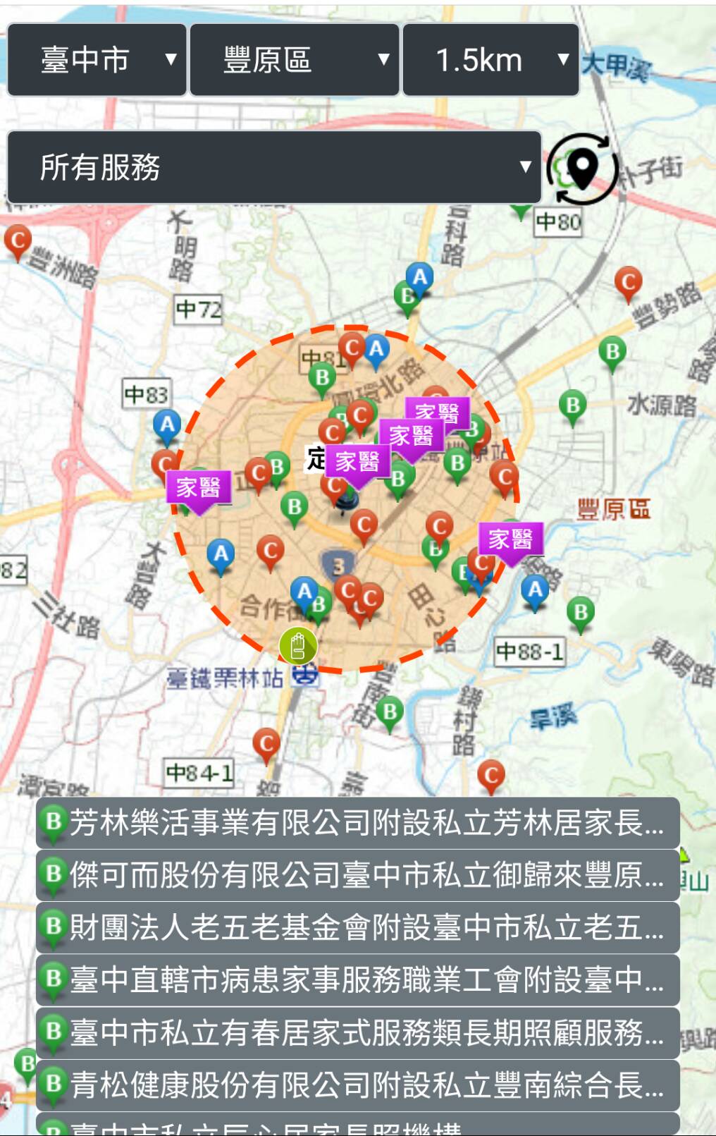 在地圖畫面上開啟手機定位,即可搜尋周邊長照服務單位,最高範圍可到方圓20公里