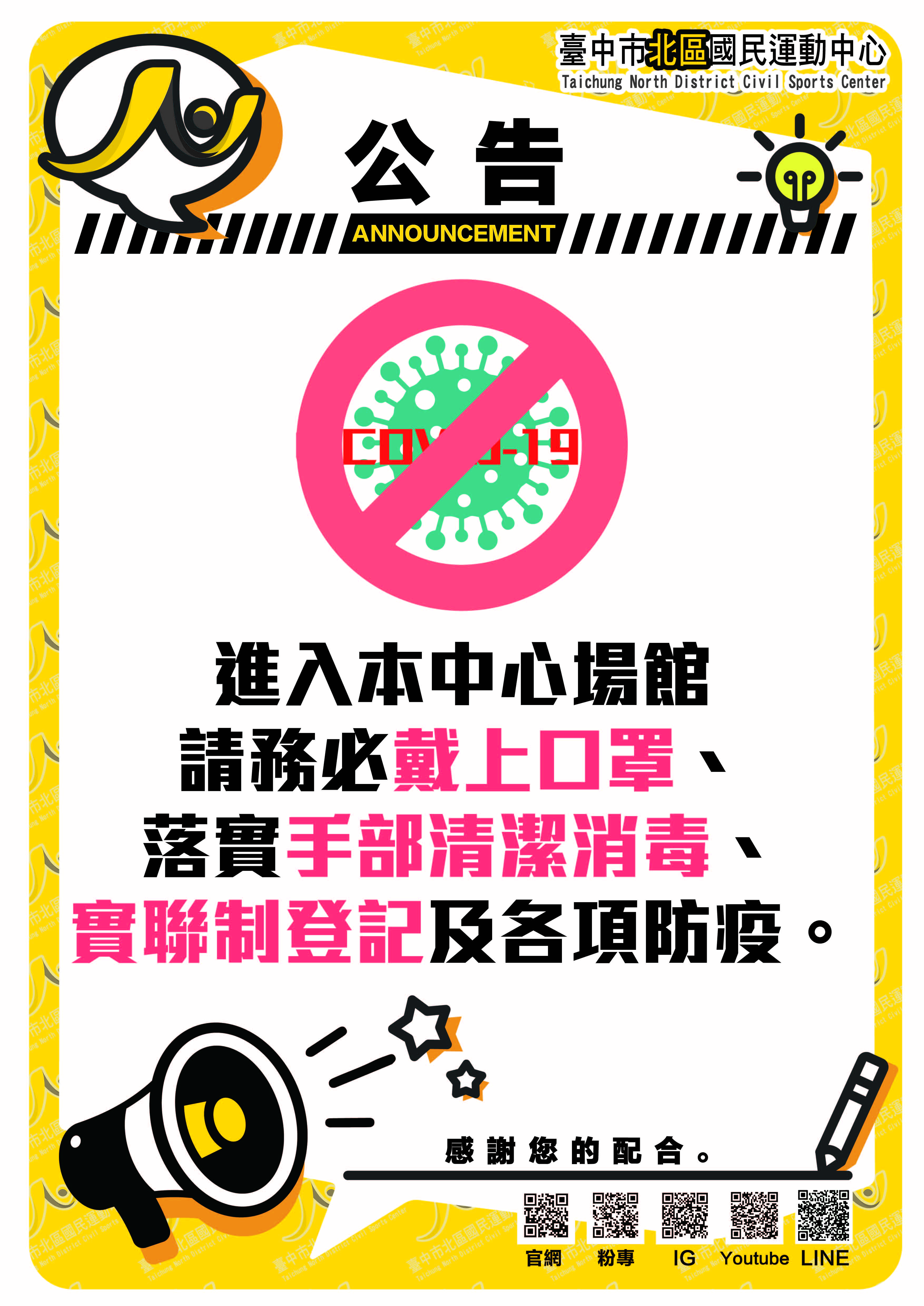 台中市政府積極嚴防疫情變化,昨(4)起國民運動中心、港區運動公園等所轄場館,配合中央流行疫情指揮中心最新防疫措施,落實「實聯制」、量測體(額)溫、手部消毒、密閉空間戴口罩、單一出入口管制等各項措施,提醒民眾配合,一同建立安心運動場所,守護自己與他人健康。