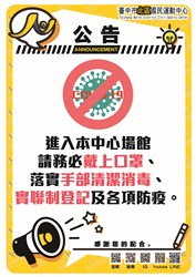 運動局指出,配合中央流行疫情指揮中心最新公告,市府昨起再度要求業者落實「實聯制」入場登記、量測體(額)溫、手部消毒、電梯前公告「進入電梯應戴口罩」及進入密閉空間應戴口罩等防疫措施,保障市民健康、維護環境衛生,提醒民眾配合。(8/5*18)*運動局