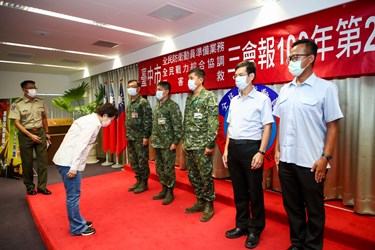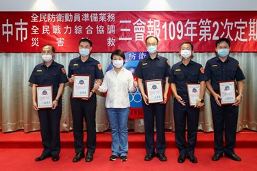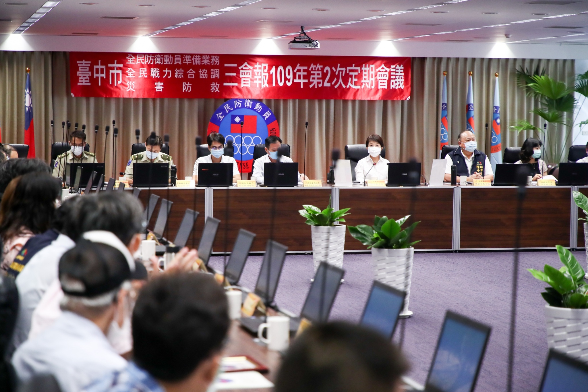 台中市政府今(18)日舉行「109年全民防衛動員準備、戰力綜合協調及災害防救三會報第2次定期會報」,除頒獎感謝國軍、警消、公民營單位在防疫、救災及動員準備工作上辛勤付出,也演練既有民防、緊急醫療、災防等應變機制;市長盧秀燕表示,台中防疫獲中央考評全國第一,防疫有賴平時各種應變演練、全體動員、市民防災意識,三方面多管齊下守護市民安全。