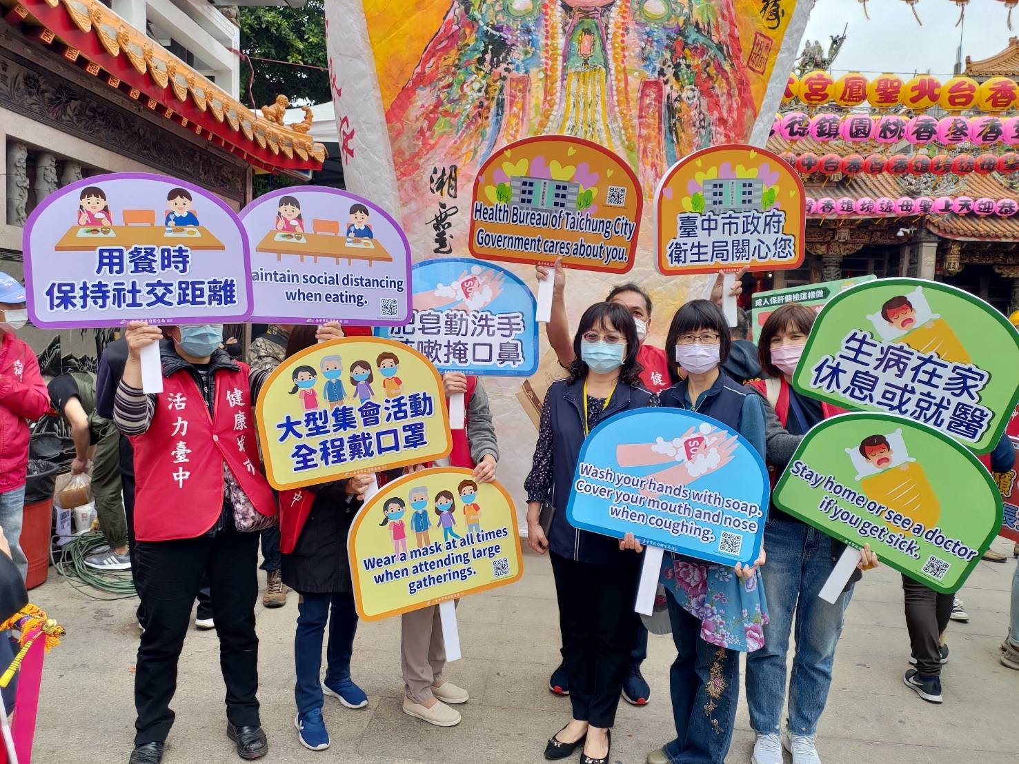 曾局長提醒,由於大型集會活動人數眾多,不易保持社交距離,會近距離接觸不特定人,呼籲民眾全程佩戴口罩、用餐時保持社交距離,並加強手部衛生,如有發燒、呼吸道相關症狀,應立即就醫,勿前往參加各項集會活動,保護自己也保護他人;此外,為強化食品安全,食品藥物安全處也在遶境前邀請大甲鎮瀾宮周邊逾80家餐飲業者參加衛生講習,並實地查核100家餐飲攤商。回鑾當日也將加強沿路點心站食品安全宣導,全面守護民眾健康。