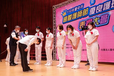 今日「110年台中市國際護師節暨優良護理人員表揚大會」由市府衛生局、社團法人台中市大台中護理師護士公會及台中市護理師護士公會合作舉辦,包含台中榮民總醫院院長陳適安、台中國軍總醫院院長洪恭誠、國軍總醫院中清分院院長王守正、台中醫院副院長林紹雯、中山附醫護理部副院長吳姿蓉、光田綜合醫院副院長張家築、大台中醫師公會理事長魏重耀、台中市醫師公會副理事長張繼森、台中市大台中護理師護士公會理事長莊淑婷、台中市護理師護士公會理事長李秋香、各醫院護理部主任等均出席;另外市議員黃仁及賴佳微服務處也派員到場。(5/7*17)*衛生局