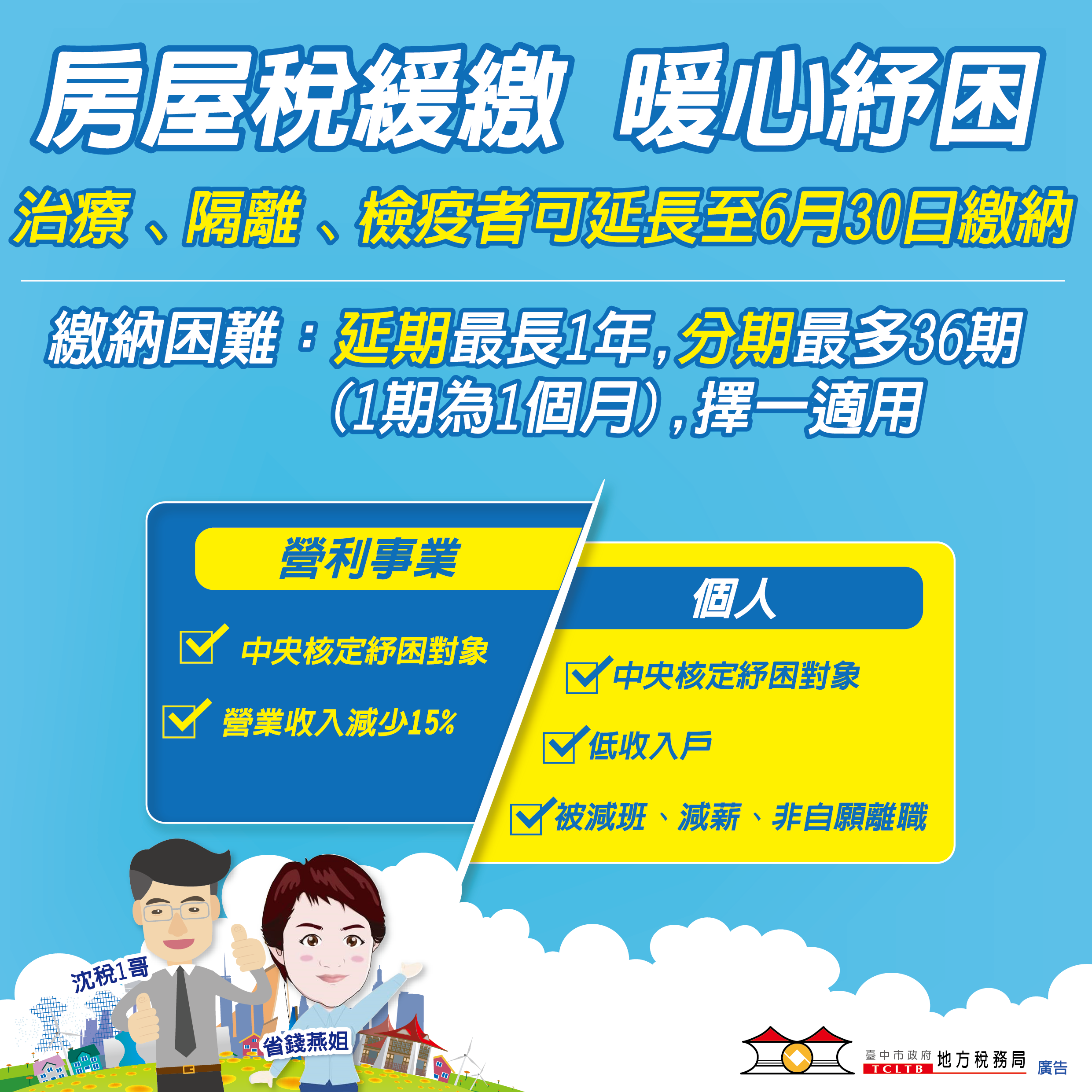地方稅務局說明,受疫情影響,個人或法人、非法人團體負責人或主辦會計人員在房屋稅法定繳納期間內接受隔離治療、居家隔離、居家檢疫、集中隔離、或集中檢疫,繳納期限可延長至今年630日。