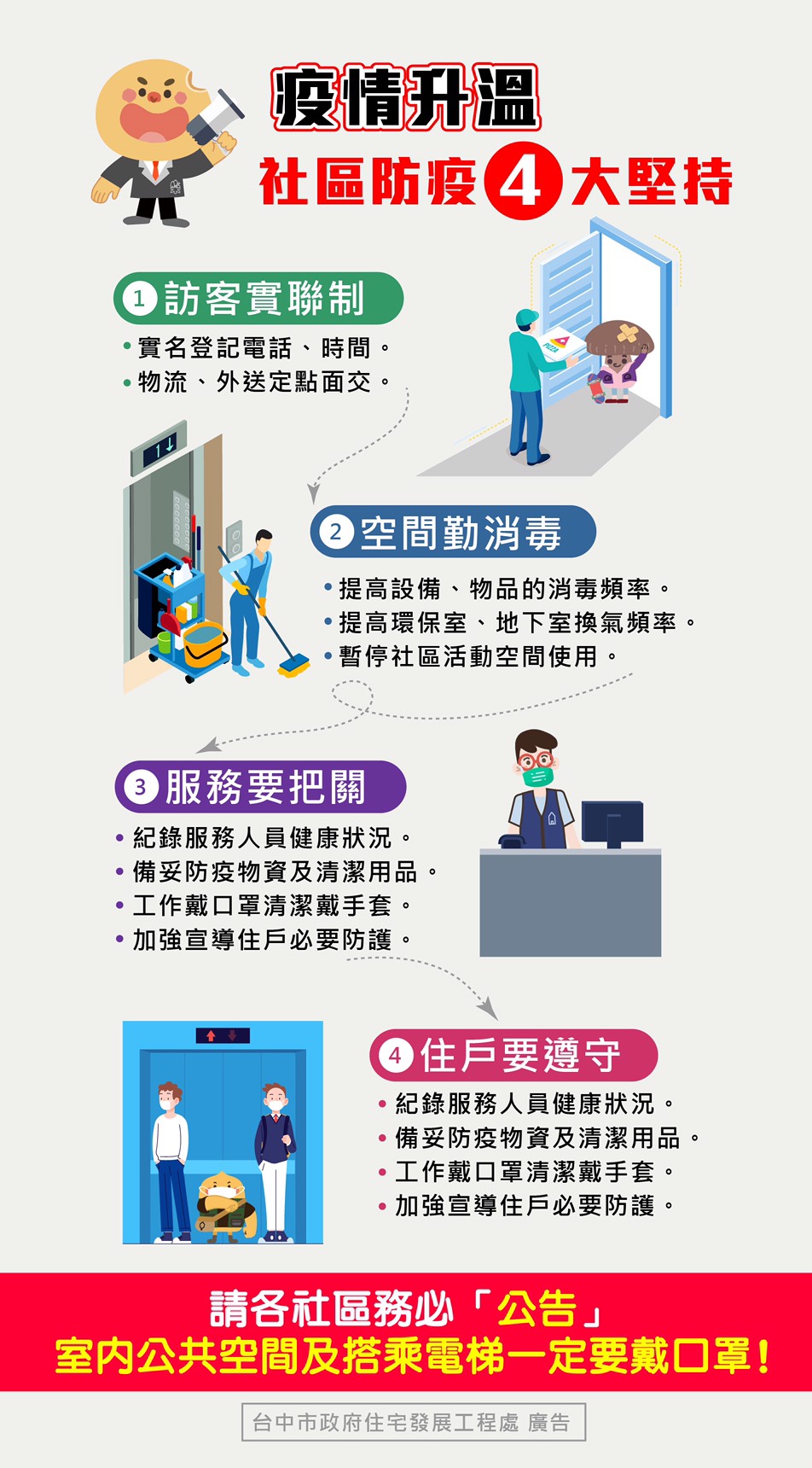 國內疫情嚴峻,台中市住宅發展工程處為守護市民健康,已請公寓大廈社區實施訪客管制規範,社區並應堅持4大守則,包括訪客實聯制、空間勤消毒、服務人員健康要把關、住戶遵守防疫措施等,共同落實社區防疫。