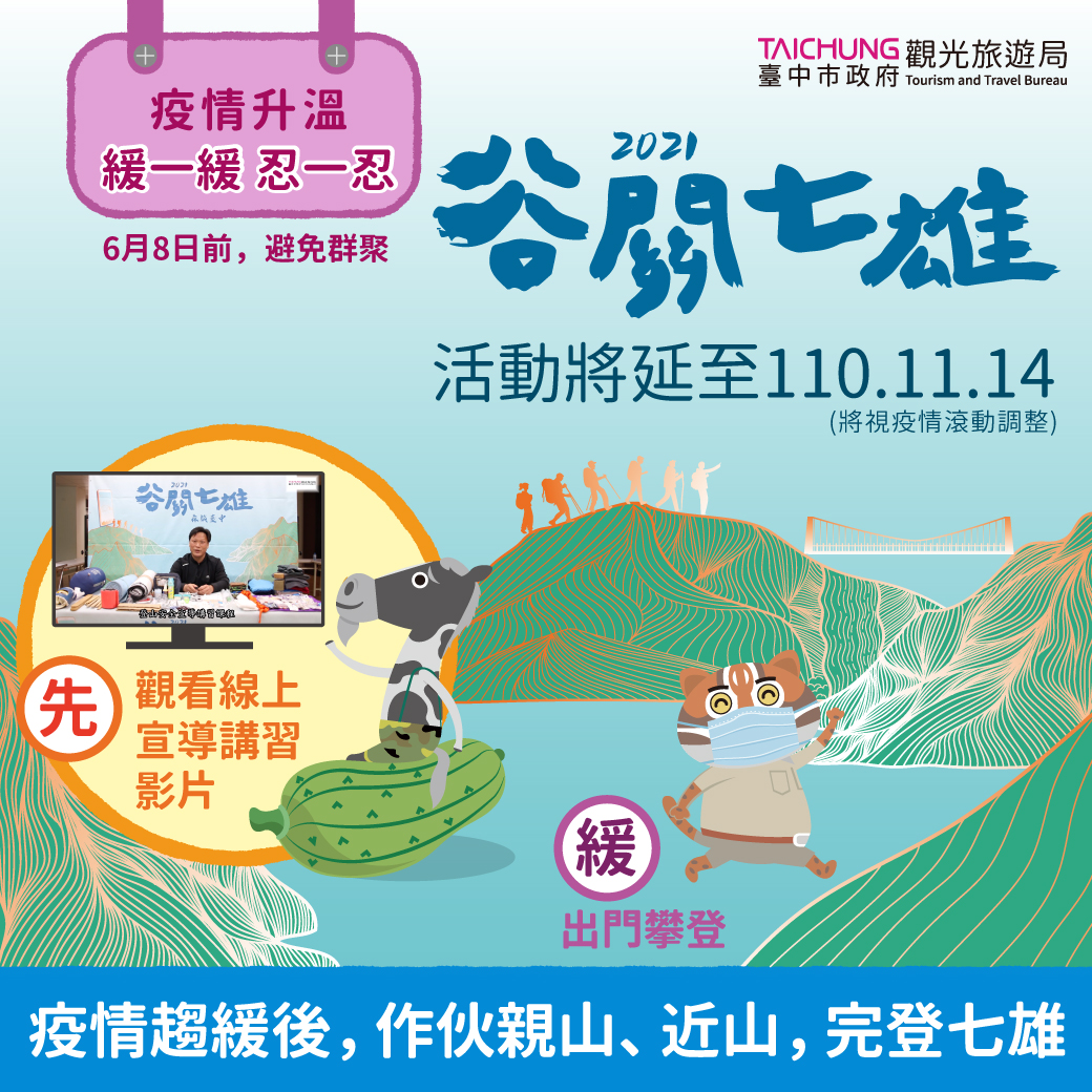 因應國內新冠肺炎疫情升溫,為減少非必要之人員流動及群聚接觸,2021谷關七雄-森旅台中活動時間將延至110年11月14日(原定110年10月31日),併視疫情發展,滾動調整。