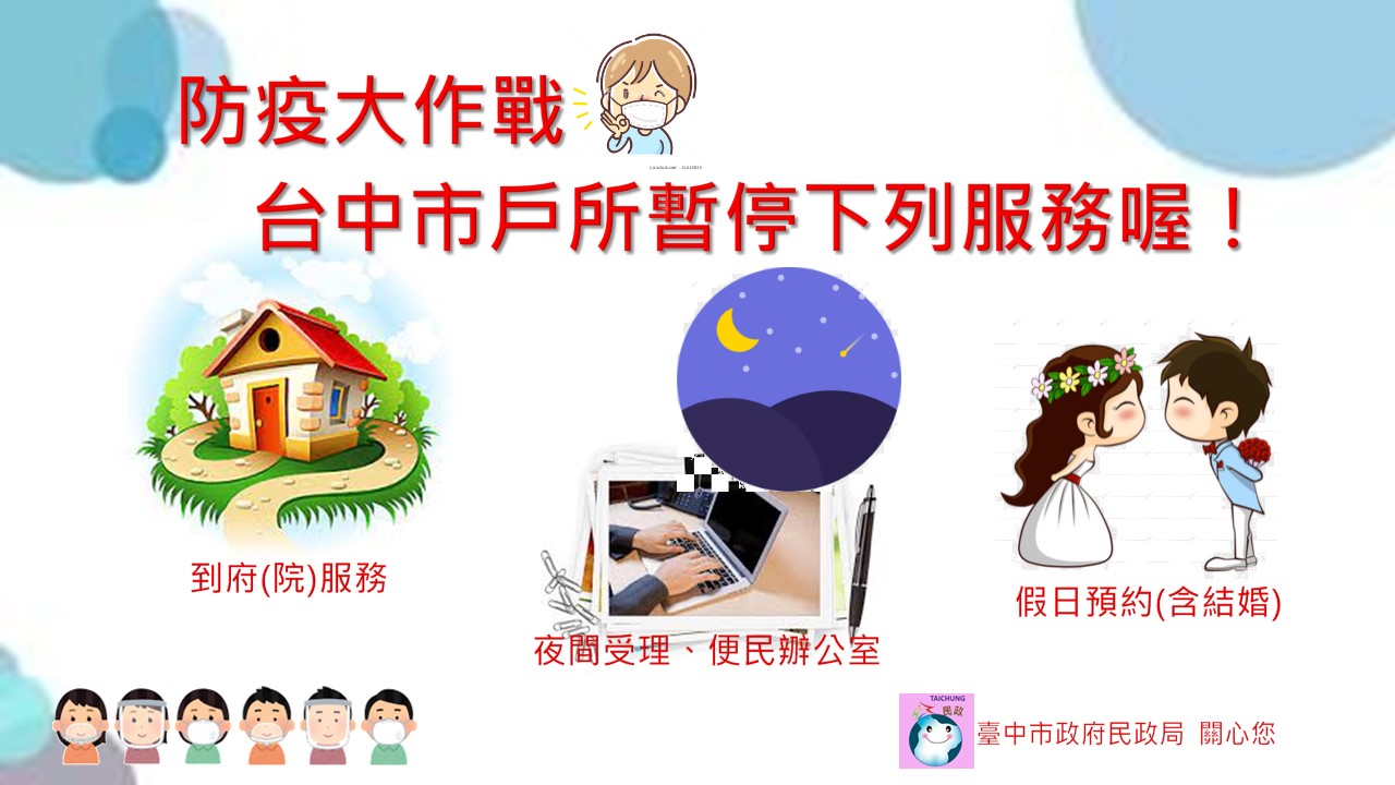 新冠肺炎疫情嚴峻,全國升至第三級警戒,為加強防疫,台中市政府民政局宣布,全市各戶政事務所自即日起暫停夜間彈性上班、到府服務、便民辦公室及假日各項便民服務(含預約結婚登記),後續將視疫情滾動調整,籲請民眾善用線上申辦戶籍登記或採預約方式,降載戶籍登記的人流、縮短接觸時間,共同努力為防疫把關。