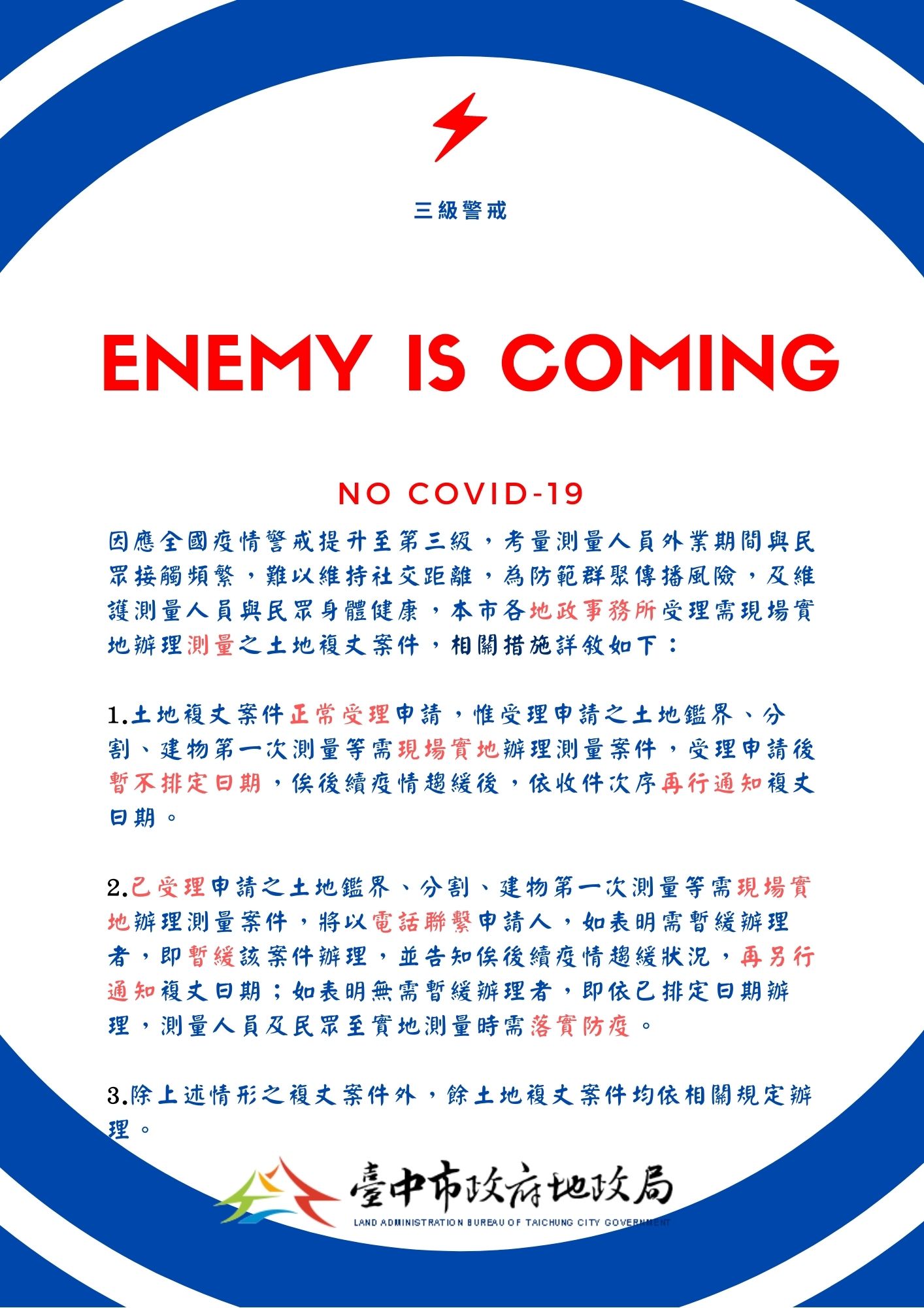 因應國內疫情嚴峻,台中市政府考量市民與地籍測量人員的健康安全,自即日起全市各地政事務所受理需現場實地測量土地複丈案件後,將暫不排定複丈日期,待國內疫情趨緩後再依收件次序排定通知,一同守護全民健康。