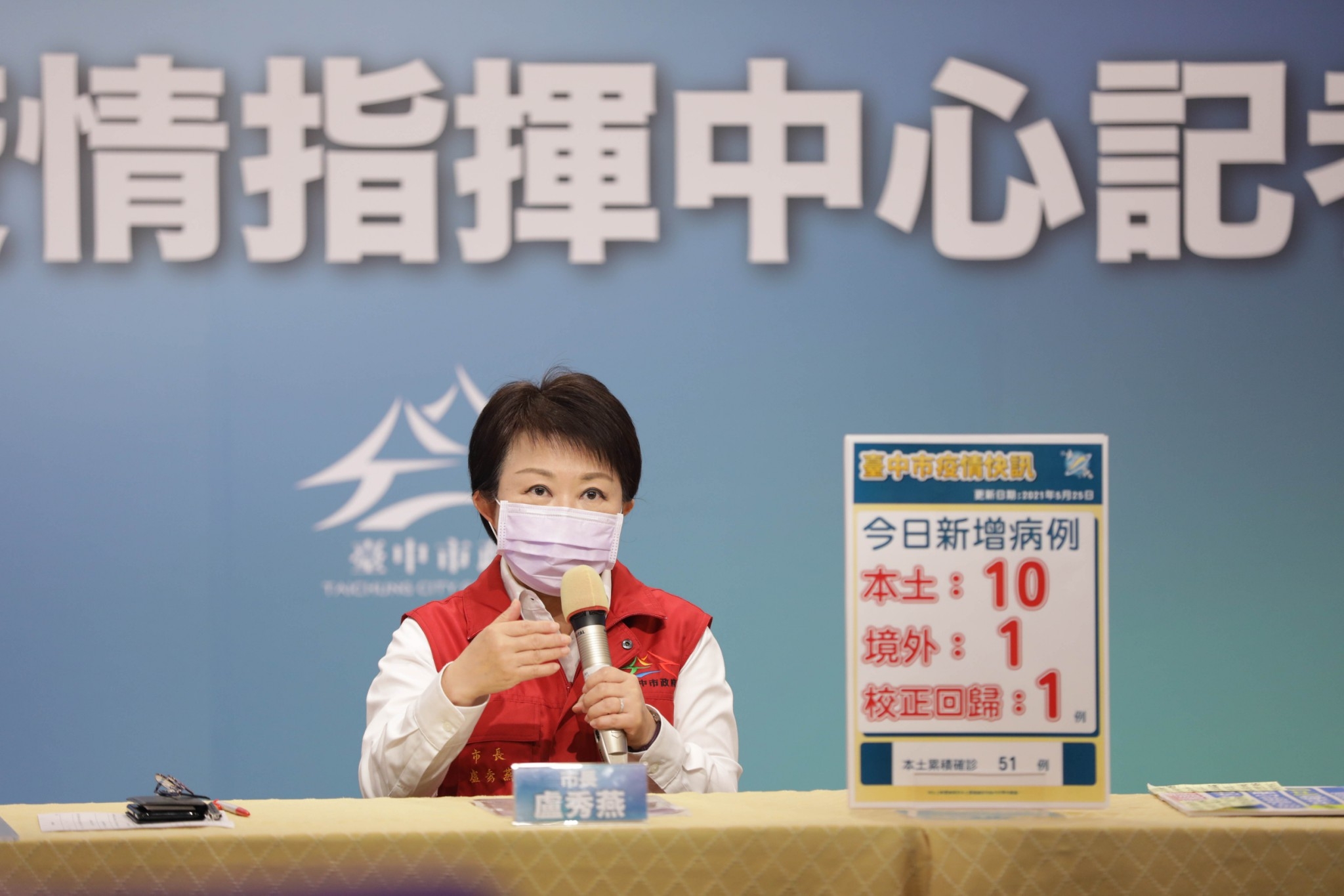 新冠肺炎疫情嚴峻,台中市長盧秀燕今(25)日下午說明台中市新增10例本土確診個案,另有1例案3128由新北市轉入台中市,她強調,市府已掌握個案相關足跡及接觸史加強清消,請市民安心;此外,她也呼籲中央統一標準調度疫苗,採購施打「全速進行」,讓前線的防疫人員及市民都能產生保護力,共同打贏這場戰役。
