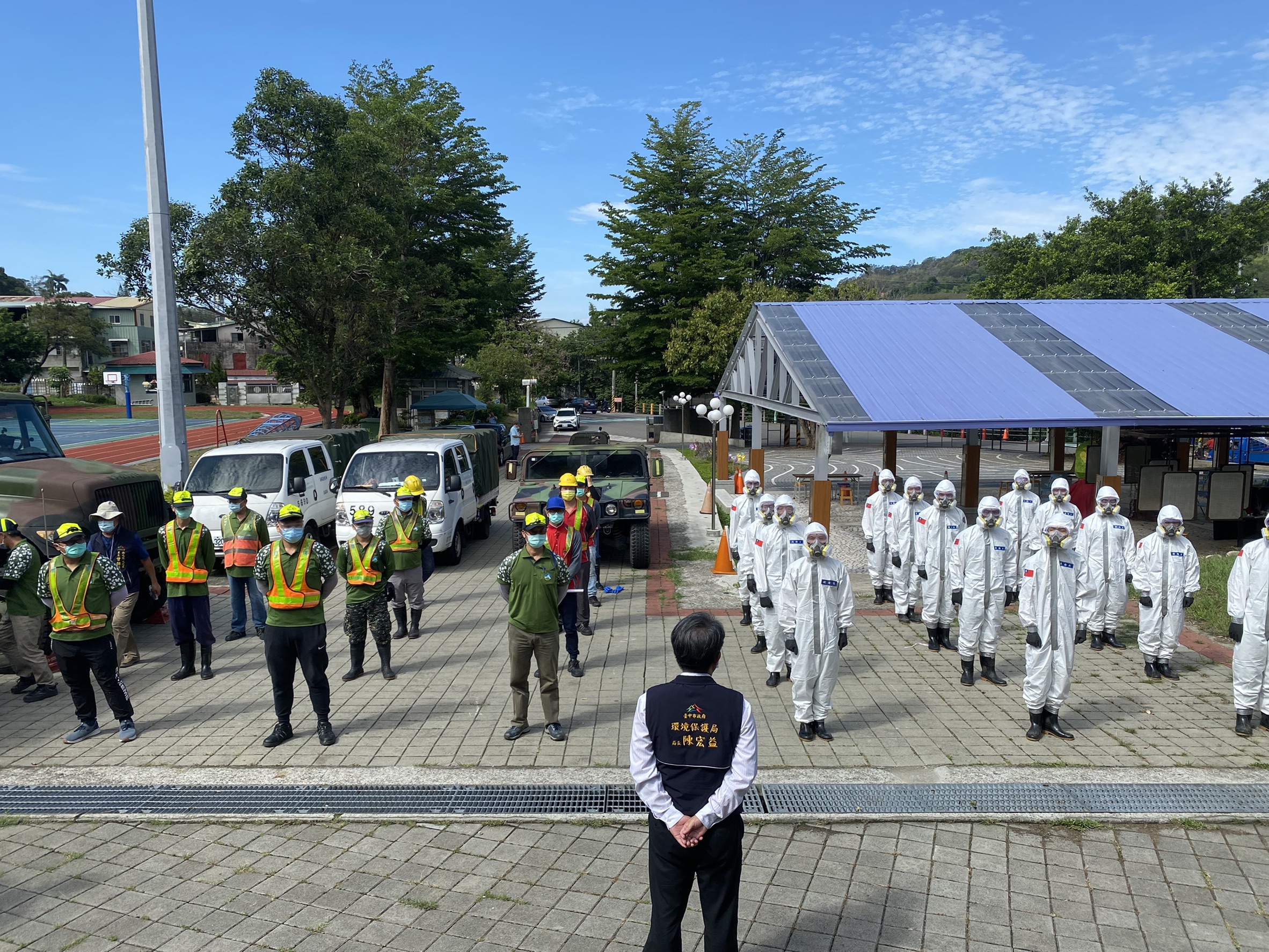 陸軍十軍團今日由楊中校、鄭少校率領36化學兵群16名官兵、出動3.5噸載重車及悍馬車各1輛、背負式消毒器及輕型消毒器各1台,及4台氣霧式消毒器等機具,前進大坑里周邊街道巷弄全面消毒,官兵們頂著烈日,穿梭巷道與民宅之間,以「防疫視同作戰」精神展開清消,確保民眾安全無虞。