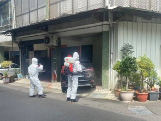 「病毒在哪裡,防疫消毒大隊就在哪裡!」環保局長陳宏益說明,從528日北屯區大坑里家庭群聚感染事件出現第一位確診者起,防疫消毒大隊每日針對足跡點及當地周邊環境「一再清消、反覆清消」。今日也調派10名同仁、4台背負式消毒機、3台水霧式消毒車與化學兵群弟兄一起執行環境大消毒,感謝同仁不辭辛勞執行防疫消毒工作,大家都是缺一不可的防疫英雄。