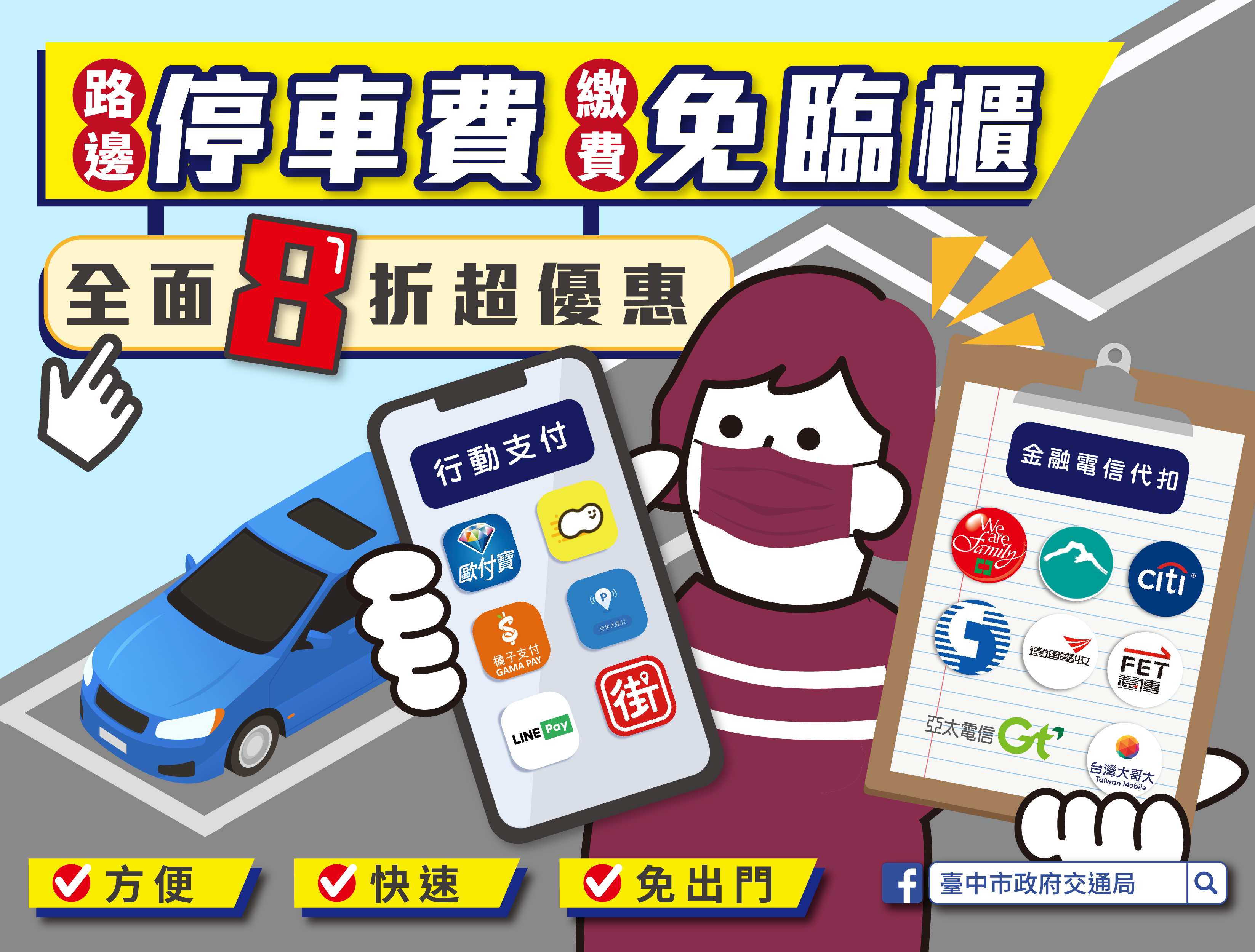 葉局長說明,民眾透過智慧型手機或平板電腦下載任一行動支付APP(歐付寶、車麻吉、橘子支付、停車大聲公、LINE Pay Money、街口支付),註冊帳戶、選擇台中市停車費、綁定車號車種並新增付款方式,停車後就會收到APP推播繳費提醒,即可輕鬆線上支付,不僅避免車主忘記或逾期繳費,且免交易手續費,還有8折優惠。