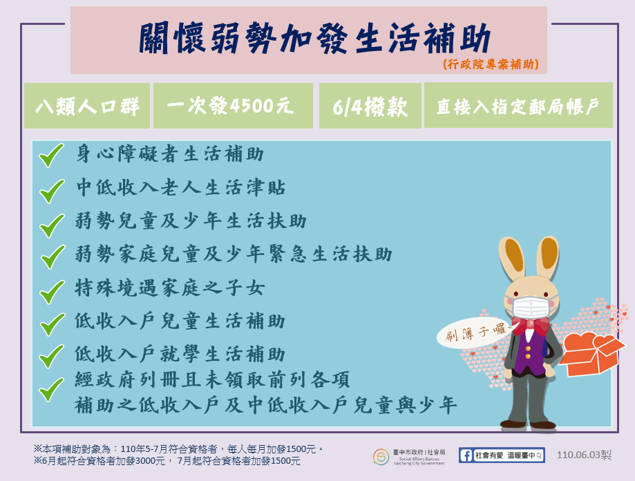 社會局說明,八類弱勢對象,含身心障礙者生活津貼、中低老人生活津貼、低收入兒童生活補助、低收入就學補助、弱勢兒少生活補助、弱勢兒少緊急生活扶助、特殊境遇家庭子女補助,及未領取上述津貼之低收、中低收未滿18歲兒少。今年5月符合資格者,每人發給4,500元,預計6月4日匯入民眾指定帳戶,台中市計有10萬1,675人,共發放4億5,753萬7,500元。