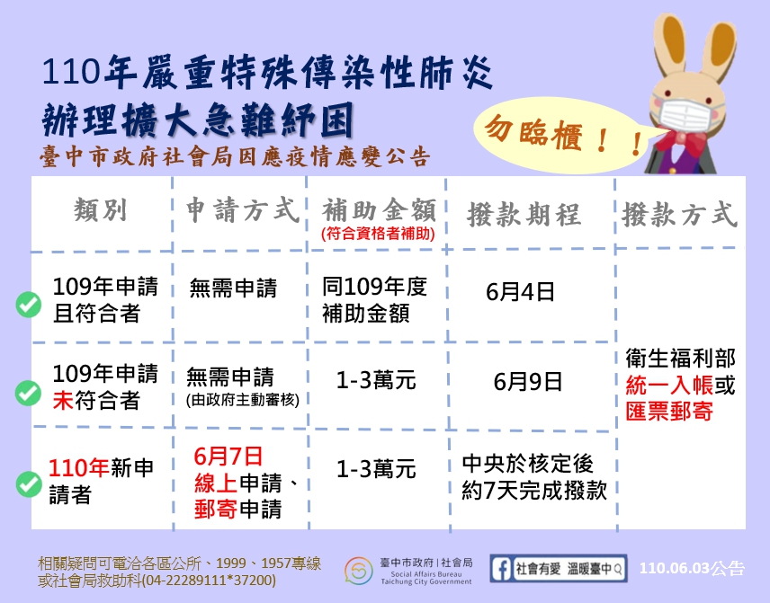 社會局表示,去年台中市擴大急難紓困總核定金額5億9301萬5,000元,有46,543戶領到擴大紓困補助,今年不用重新申請,衛福部已主動查調,核定後6月4日撥款;有20,142戶申請但未符合資格,衛福部一樣會主動查調,如今年符合資格,完成核定後6月9日撥款。至於今年新申請案,6月7日起可線上申辦、郵寄為輔(免付郵資,寄到南港昆陽郵局第520號信箱),相關細節衛福部尚在規劃中。