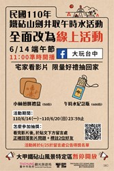 因應疫情嚴峻,台中市風景區管理所舉辦「鐵砧山劍井取午時水活動」全面改為線上參與,今(14)日端午節正式上線,趣味生動的動畫影片上午11時上架「大玩台中」臉書粉專,引起熱烈迴響,許多網友紛紛在活動貼文留言,熱情參與「看影片抽獎活動」,希望抽中劍井午時水紀念瓶,活動至6月20日23時59分截止,台中市政府觀光旅遊局邀請大小朋友,在家線上觀看大甲鐵砧山劍井午時水故事影片,認識端午節民俗文化,感受節慶氣息,還有機會抽到限量午時水紀念瓶,安心防疫又祈福。