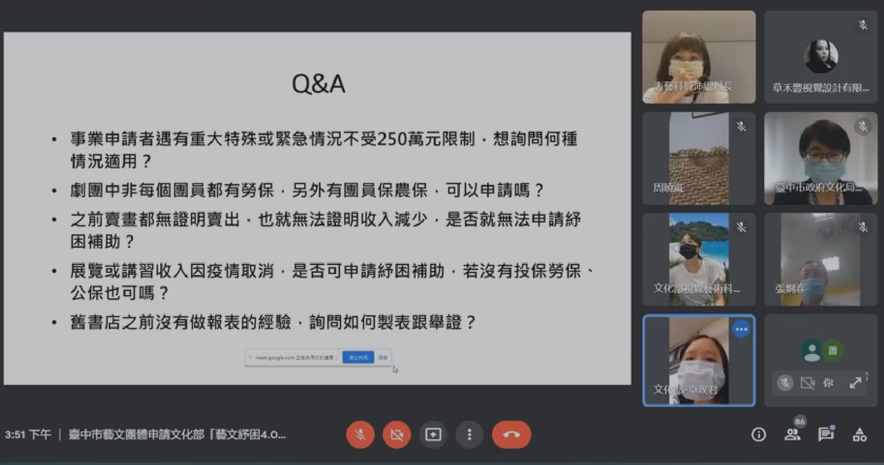 文化局表示,線上說明會邀請國立中山大學陳志維講師說明文化部目前藝文紓困4.0的申請類別及流程,視覺設計師鄭秀芳和文訊雜誌社主任詹宇霈則分別建議申請紓困時盡量以條列式、量化表格說明受影響的情況和損失。為即時解答藝文工作者提出的問題,包括申請資格和準備佐證資料等,說明會同時邀請文化部藝術發展司、人文及出版司科長線上回應參與者的提問,台中市議員王立任也全程參與。