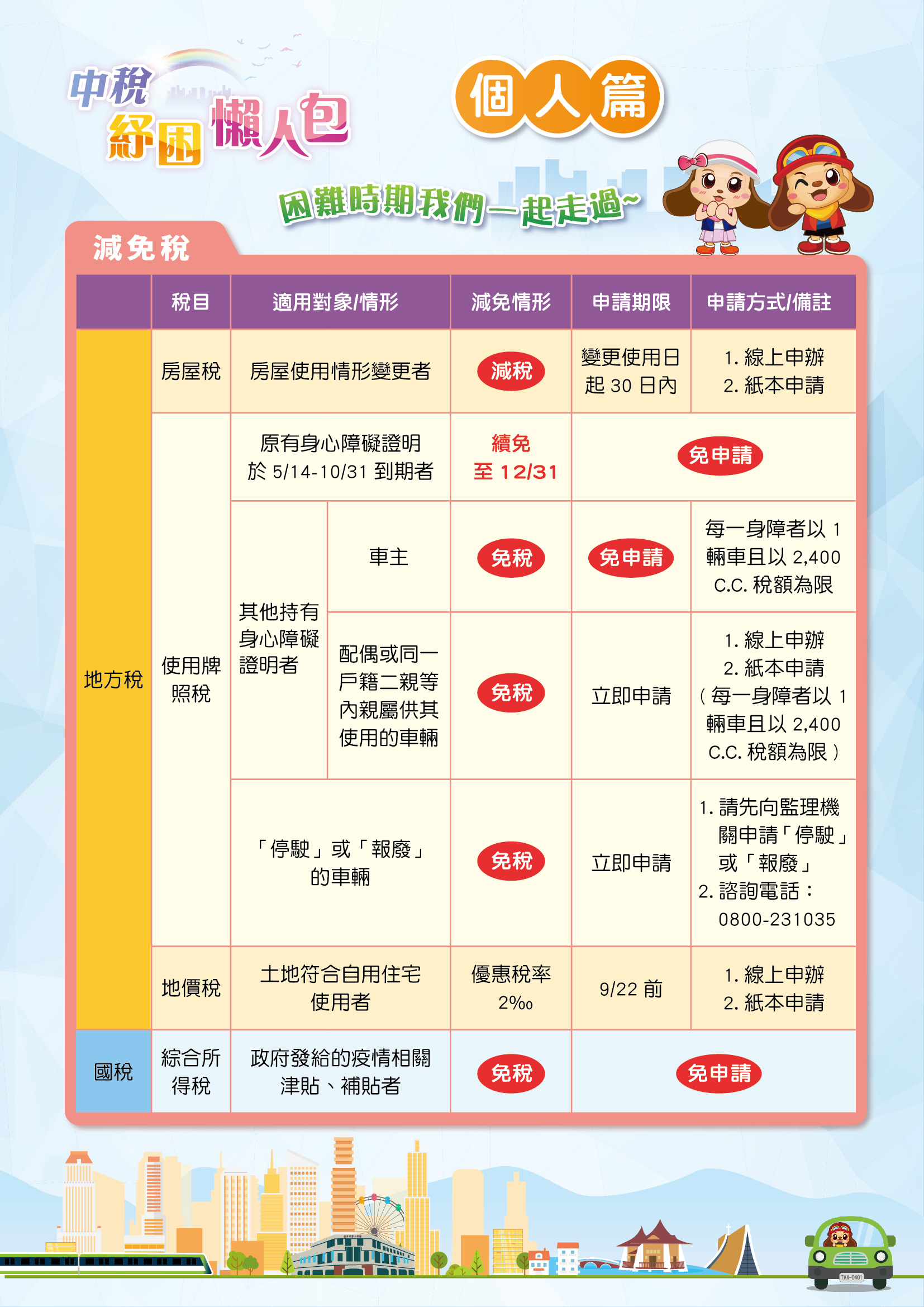 稅務局表示,為減輕民眾及業者負擔,市府主動減免受強制停業者房屋稅、娛樂稅,以及專案輔導房屋稅、娛樂稅、使用牌照稅及地價稅等減免;受疫情影響有繳納困難者,則提供延期或分期繳納。由於民眾與業者紓困需求不同,特別一次網羅地方稅與國稅節稅措施,將繁複艱澀的內容加以簡化,客製化個人版及營利事業版節稅措施彙整表,讓民眾及業者清楚易懂,節省自行搜尋資料的時間。