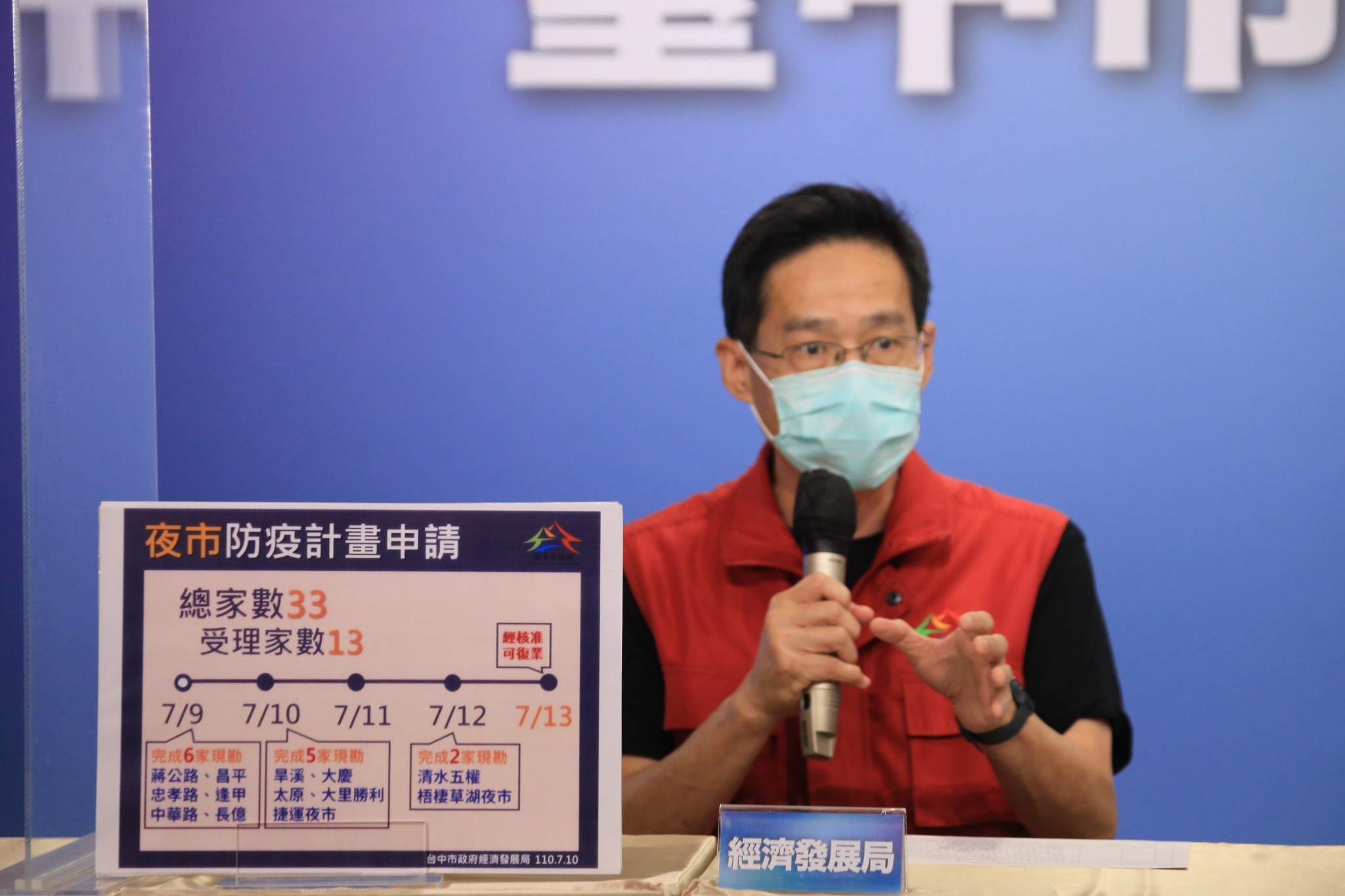 張局長表示,目前共受理13處夜市申請,包含逢甲、中華、忠孝、蔣公路、昌平、長億、旱溪、大慶、太原、清水五權、捷運、大里勝利及梧棲草湖夜市,第一階段書面審查皆符合規定,第二階段進行現勘,目前已於79日下午及10日上午完成11場次現勘,預計12日可完成至少11場次內部審核程序,並發文通知夜市依所提計畫確實執行相關工作。