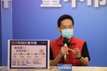 經發局長張峯源說明,台中33處公告停業夜市採「申請程序」、「管制措施」等兩大原則,夜市防疫計畫申請已於7月8日公告在經發局網站(https://bit.ly/3yHxHLp  ),由夜市管理委員會或負責人擬具防疫計畫書,夜市提出的防疫計畫書內容應提出具體因應作為,如減少出入口、專責人力負責實聯制、量測體溫、手部消毒、監控容留人數,及攤商與工作人員造冊、健康狀況監測、訂定環境清消計畫、如發生確診病例時的應變措施等。