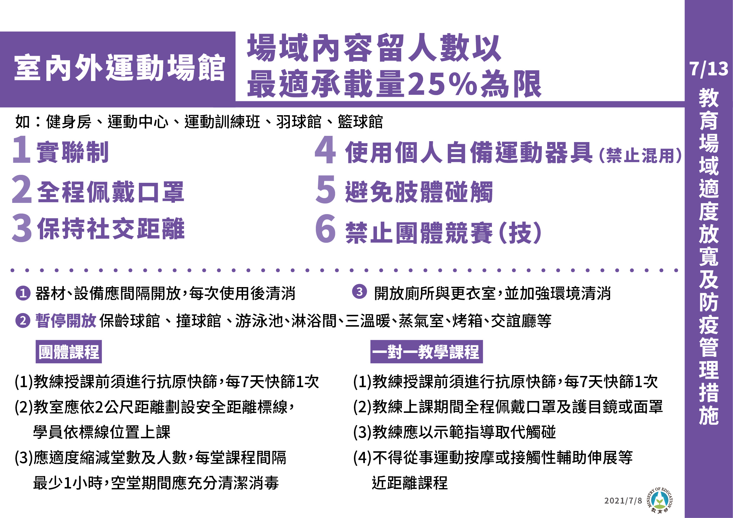 運動局指出,如對「競技及休閒運動場館業防疫管理措施」有相關疑問,可撥打教育部體育署諮詢專線02-8771151502-8771184302-8771184702-87711881洽詢。(7/13*17)*運動局
