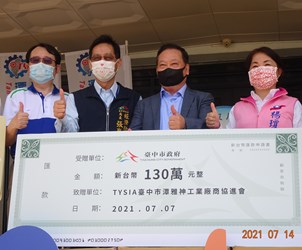 台中市潭雅神工協會理事長黃加再表示,國內疫情爆發後,第一線防疫人員非常辛苦執行防疫工作,協會本著取之於社會,用之於社會的精神,集合會員力量共同捐贈台中市政府130萬元,善盡企業社會責任,與市府共同對抗新冠肺炎疫情。