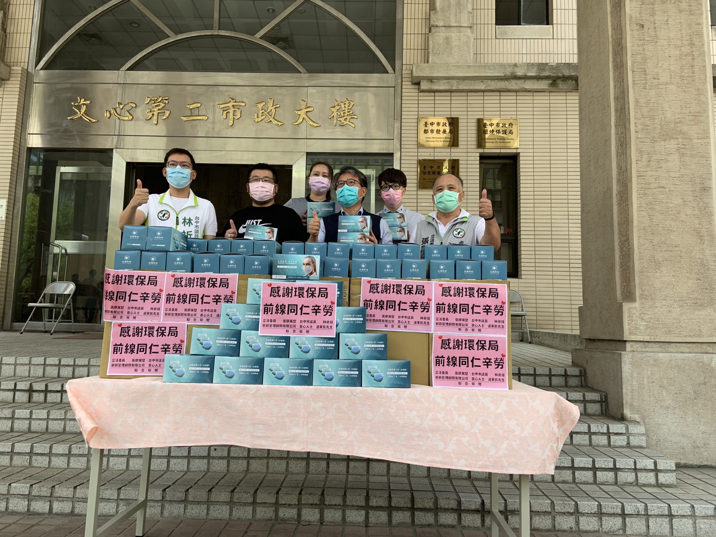 環保局指出,清潔隊員每日例行工作除了清運垃圾及維護市容環境外,疫情期間又增加了繁重的清消任務,冒著染疫風險守護市民健康,防疫物資及裝備需求量也大增。為了給這些防疫英雄加油打氣,台中市議員陳政顯、張瀞分及吳瓊華等人與台灣水木清華校友會,暖心捐贈口罩1,076盒、500毫升乾洗手凝露120瓶,以及236毫升乾洗手液1,074瓶、100毫升2,120瓶,讓清潔隊員執勤無後顧之憂。