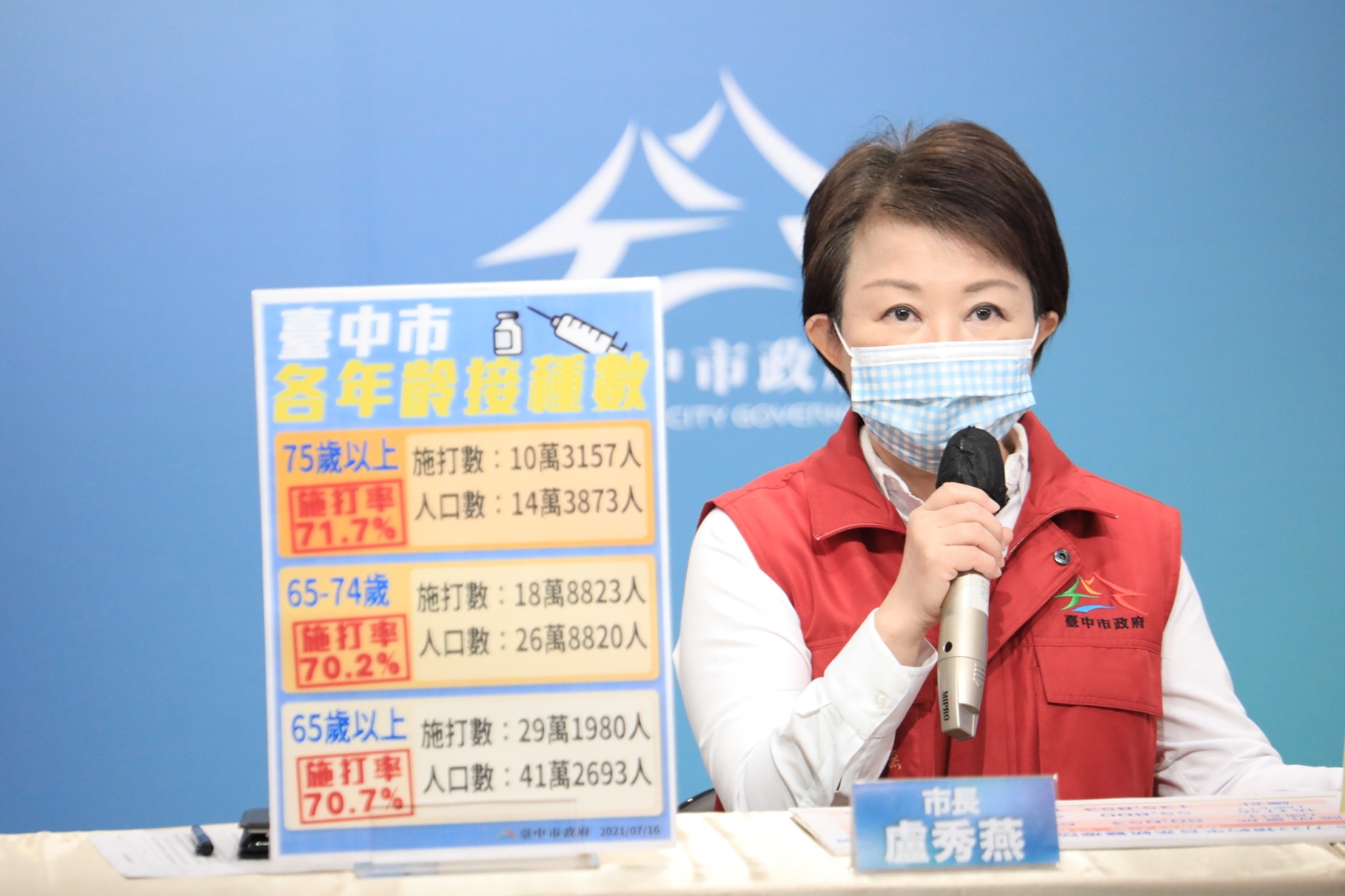 盧市長今日下午召開台中市疫情指揮中心線上記者會表示,台中市75歲以上人口有14萬3873人,已施打疫苗有10萬3157人,施打率為71.7%;65至74歲人口有26萬8820人,已施打疫苗有18萬8823人,施打率為70.2%,無論是「第六類」75歲以上長輩,或「第八類」65至74歲長輩,施打率都突破7成;統計該兩類年齡層,台中65歲以上人口有41萬2693人,已施打29萬1980人,施打率70.7%,施打率也破7成,達「三個7」,加上台中疫苗剩餘率「本島最低」,顯示台中施打進度超前很多。