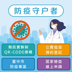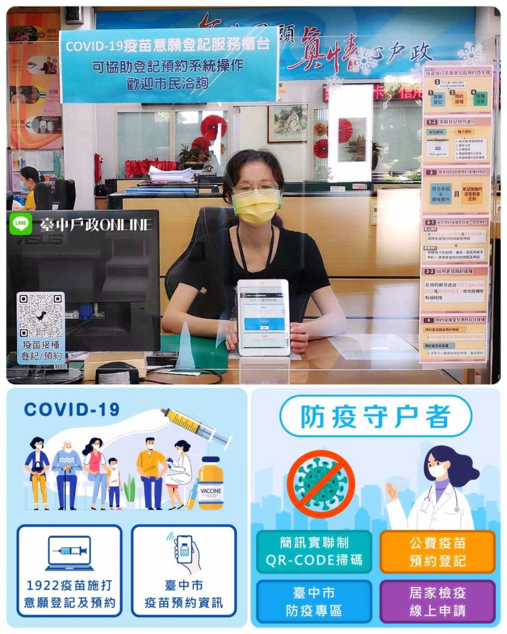 而為方便服務櫃台同仁迅速提供疫苗預約平台連結說明,民政局即時整合升級「台中戶政ONLINE」官方帳號防疫相關資訊,除原先即有的「簡訊實聯制QR-CDODE掃描」、「台中市防疫專區」及「居家檢疫線上申請」連結資訊,此次新增「公費疫苗預約登記」查詢功能,並提供「1922疫苗施打意願登記及預約」及「台中市疫苗預約資訊」網址連結,將分散在不同網站的訊息統整,協助民眾快速查找,輕鬆掌握防疫資訊。