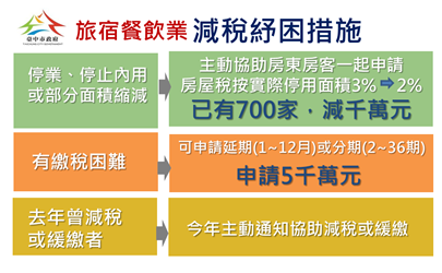 地方稅務局長沈政安表示,供旅館及餐飲業使用的房屋,依規定應按營業用稅率(3%)課徵房屋稅。去年疫情爆發以來,旅宿及餐廳業首當其衝,許多業者縮減營業面積或規模,降低成本。目前疫情雖有趨緩,但旅宿及餐飲業者仍有部分面積停用或停業,該局延續紓困措施,主動協助業者於停用期間改按「非住家非營業用」稅率(2%)課徵房屋稅。