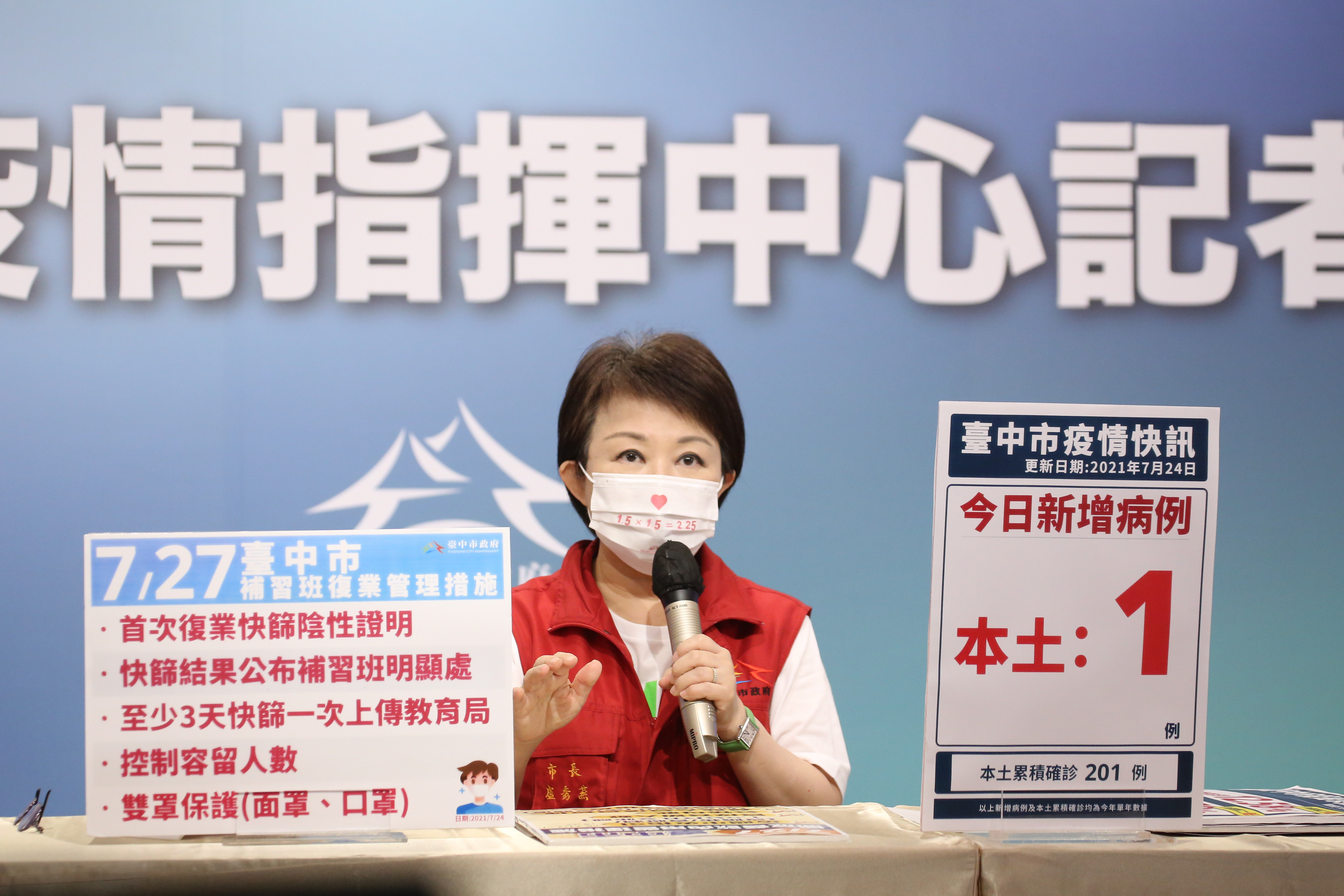 中央宣布全國疫情警戒7月27日至8月9日降為二級,針對外界關心補習班是否開放上課,市長盧秀燕今(24)日表示,台中補習班近3,000家,從業人員約2萬多人,服務對象多是未接種疫苗的孩子,經市府審慎評估,將依中央防疫指引,加上地方防疫考量,朝「有條件開放」,包括業者須提出復業申請、檢具快篩陰性證明及從業人員需配戴雙罩等,才能恢復實體上課。