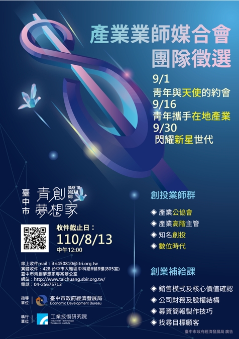 經發局表示,市府「青秀台中」青年政策多管齊下,設立青創夢想家單一服務窗口,提供資金協助、孵化培育、投資媒合、串聯交流、輔導取得政府資源等五大功能,打造台中成為創業友善城市。產業業師媒合會活動申請自即日起至813日中午12時截止,相關資訊請至台中市青創夢想家官網 https://www.taichung-sbir.org.tw/ 查詢,或洽專案辦公室專線04-25675713。(7/28*6)*經濟發展局